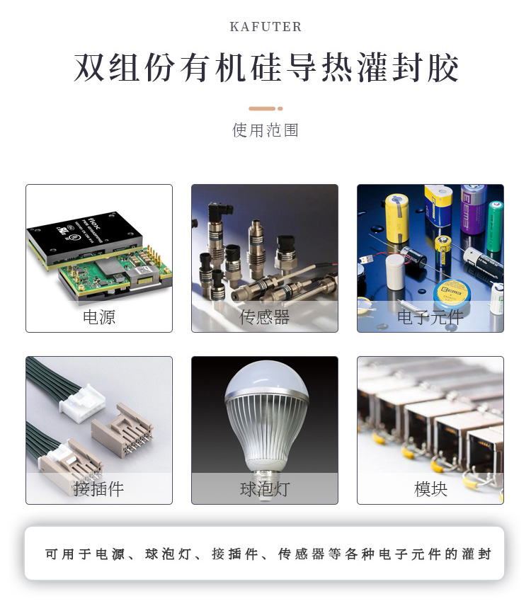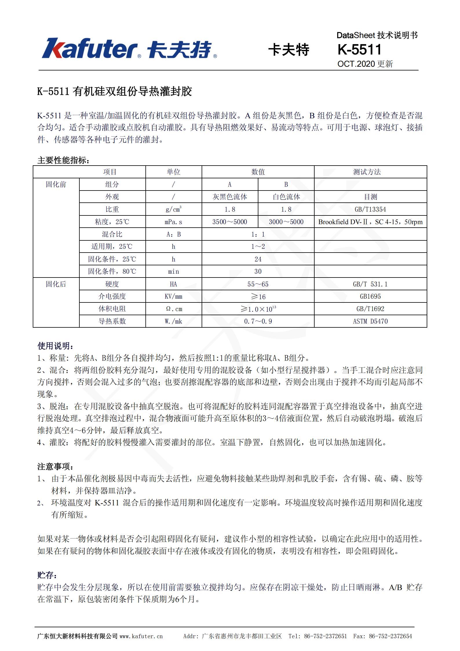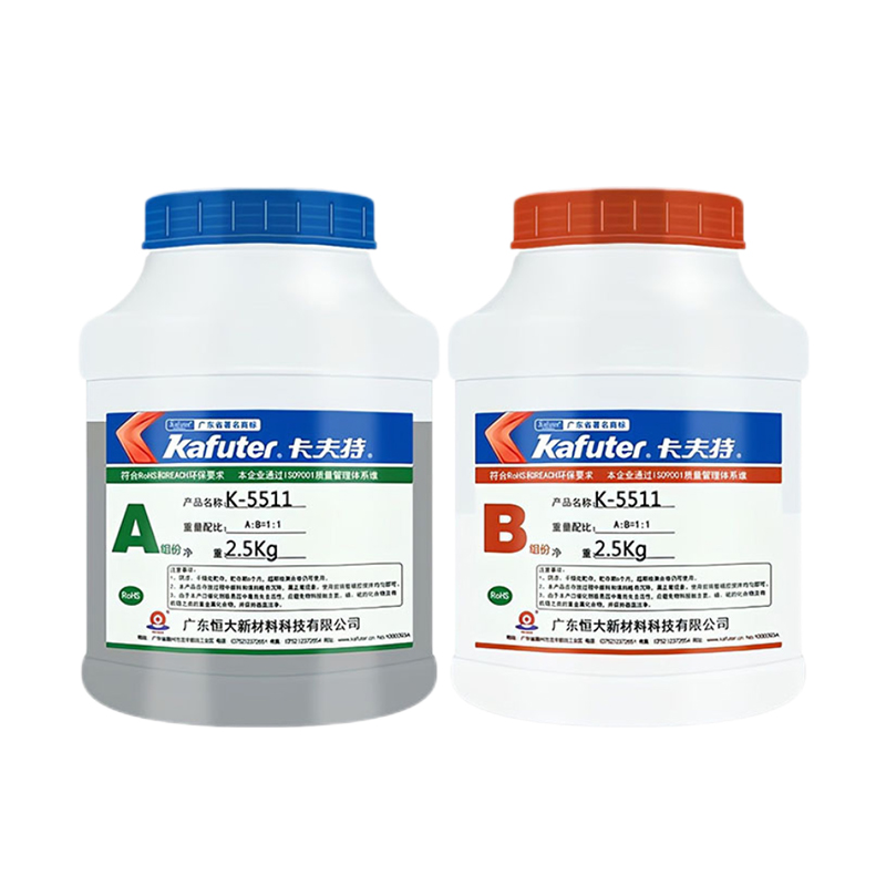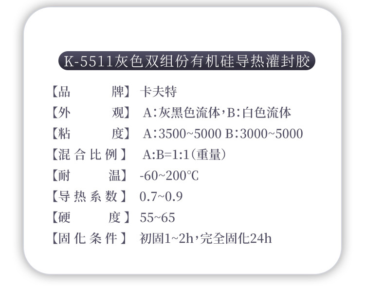 卡夫特K-5511导热阻燃灌封胶是一种室温加温固化的有机硅双组份导热灌封胶。A组份是灰黑色,B组份是白色,方便检查是否混合均匀。适合手动灌胶或点胶机自动灌胶。具有导热阻燃效果好、易流动等特点。可用于电源、球泡灯、接插件、传感體等各种电子元件的灌封。卡夫特Kafuter官方授权经销商-东莞德润密封材料有限公司