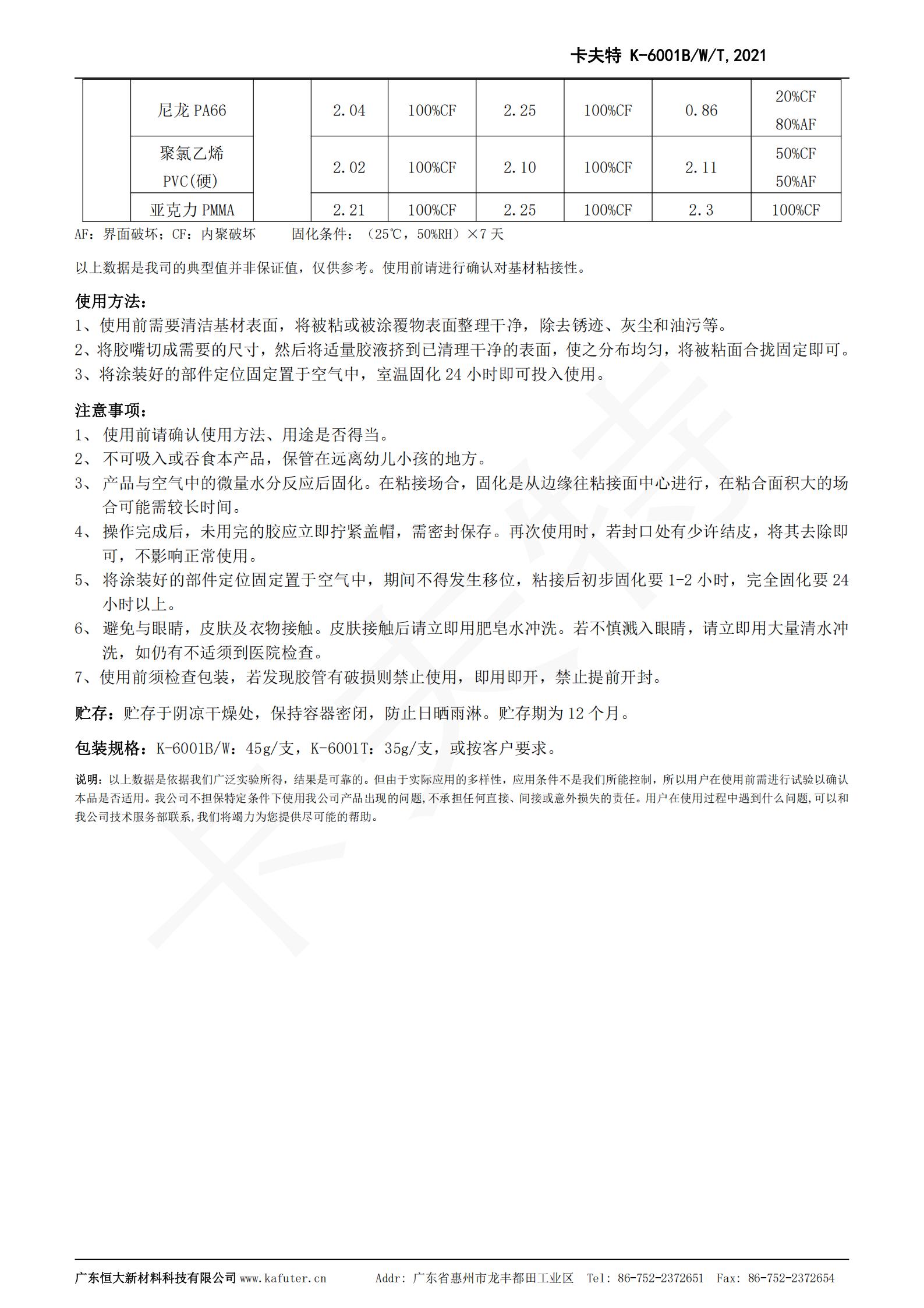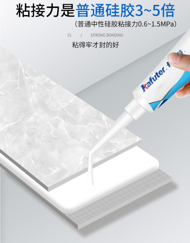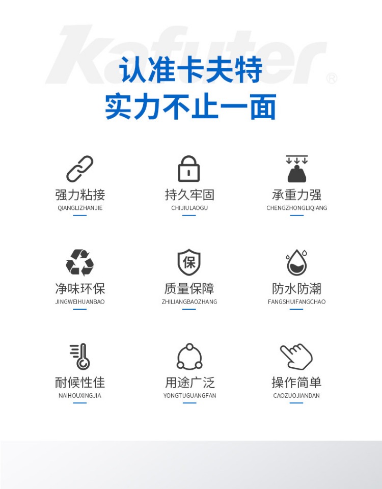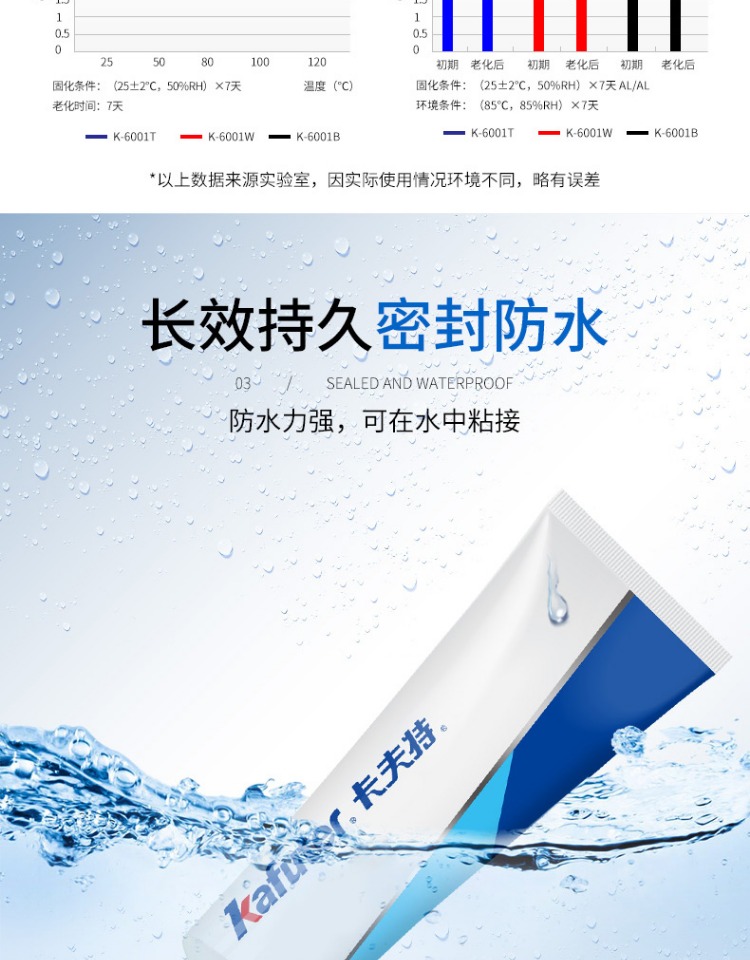 卡夫特K-6001W MS硅烷胶强力胶透明玻璃胶封边填缝车门堵漏密封胶K-6001系列是一种无溶剂类单组分室温湿气固化粘接密封胶,主要成分是甲硅烷基的特殊聚合物。常温露置于空气中快速固化。气味小,不腐蚀产品外观,具有初期粘接性好,粘度适中,操作方便。高性能,固化物韧性好,具有良好的耐久性和电气特性,耐振动、冲击的应力缓和性良好;耐高低温性能良好(-40℃~100℃)。适用材料广,粘结强度高,对于各种金属,塑料,橡胶,陶瓷等各种材料不要求做特殊表面处理便可获得优异的粘接效果。卡夫特Kafuter官方授权经销商-东莞德润密封材料有限公司www.gzderun.com,销售服务热线:15817734885,李经理