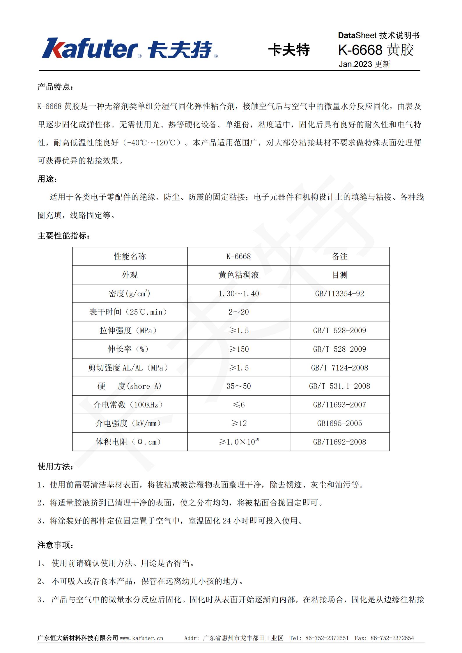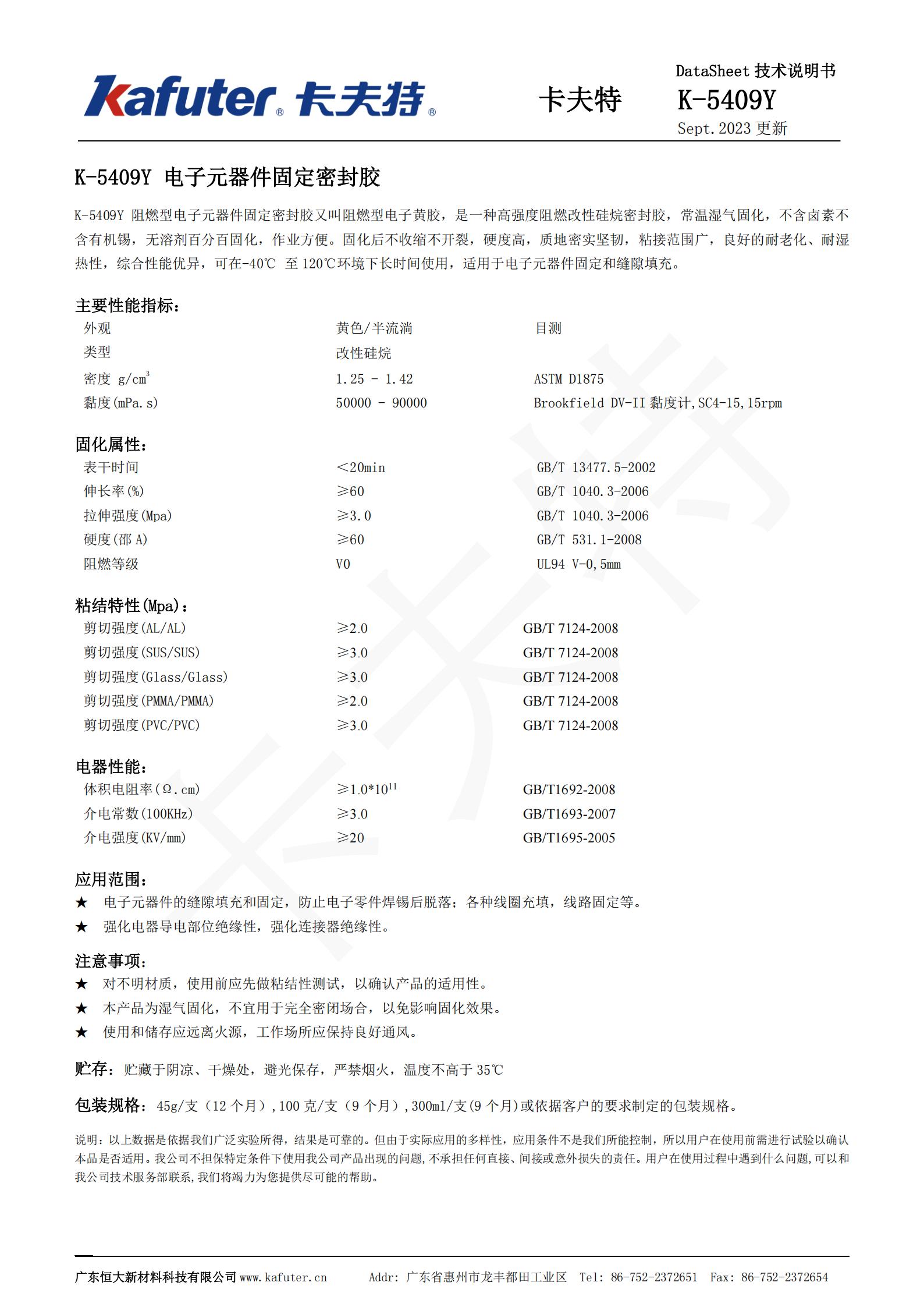 卡夫特K-5409阻燃型电子元器件固定密封胶又叫阻燃型电子白胶,是一种高强度阻燃湿气固化改性硅烷密封胶,不含有机锡,无溶剂百分百固化,作业方便。固化后不收缩不开裂,质地密实坚韧,粘接范围广,综合性能优异,可在-40C至120C环境下长时间使用,适用于电子元器件固定和缝隙填充,经环境测试过,基本特征无变化。