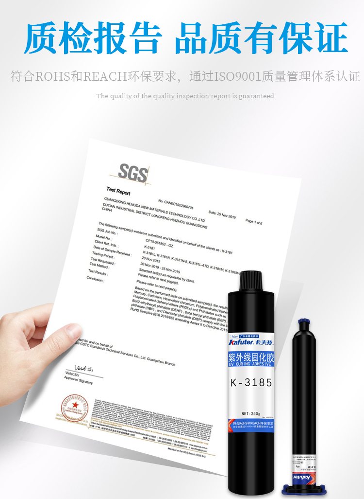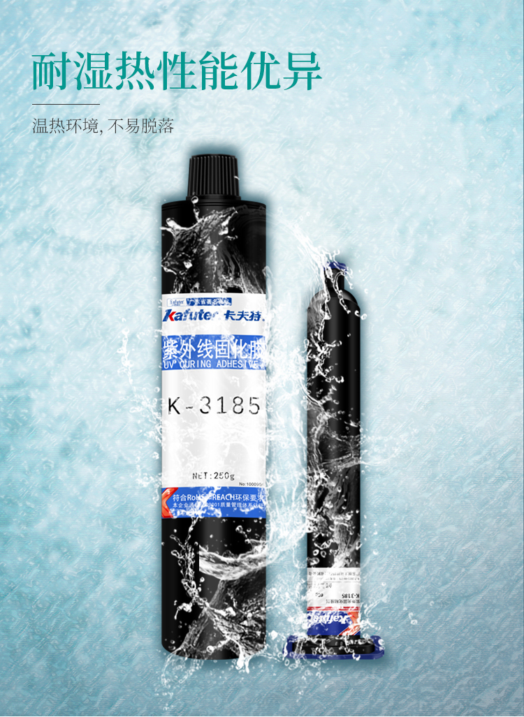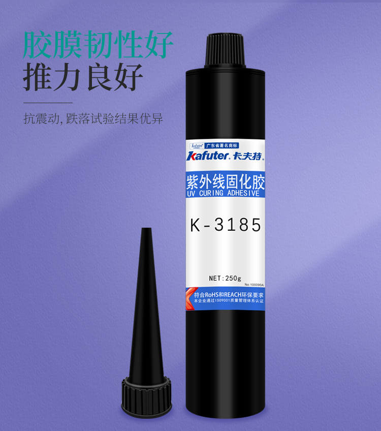 K-3185是单组分紫外光固化丙烯酸酯类胶粘剂,对于玻璃、金属和聚碳酸酯PC、聚氯乙烯PVC等塑料具有优异的粘接力,固化胶膜韧性好,耐湿热性能优异,适用于各类焊点保护,元器件固定密封以及玻璃金属等材质的粘接卡夫特Kafuter官方授权经销商-东莞德润密封材料有限公司www.gzderun.com,销售服务热线:15817734885,李经理
