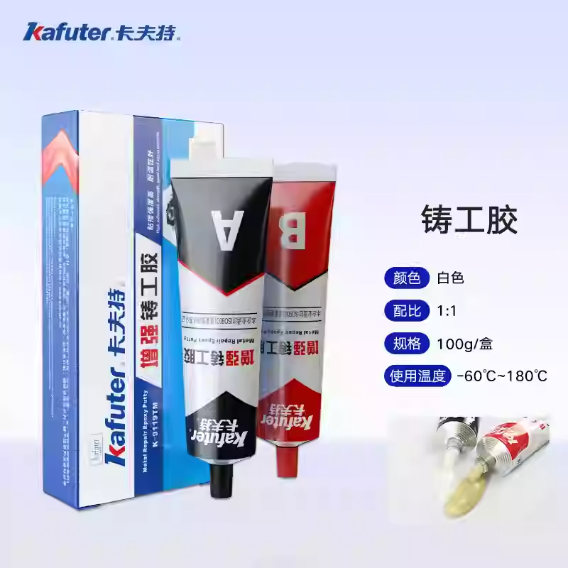铸工胶产品为常温固化型双组分环氧胶,其在常温情况下固化速度适中,而且在温度条较低的件下也,可完全固化。本品主要用于铁质、钢质铸件砂眼、气孔或裂纹等铸造缺陷的填补,固化物硬度高,能在-20-120℃下使用。卡夫特Kafuter官方授权经销商-东莞德润密封材料有限公司www.gzderun.com,销售服务热线:15817734885,李经理