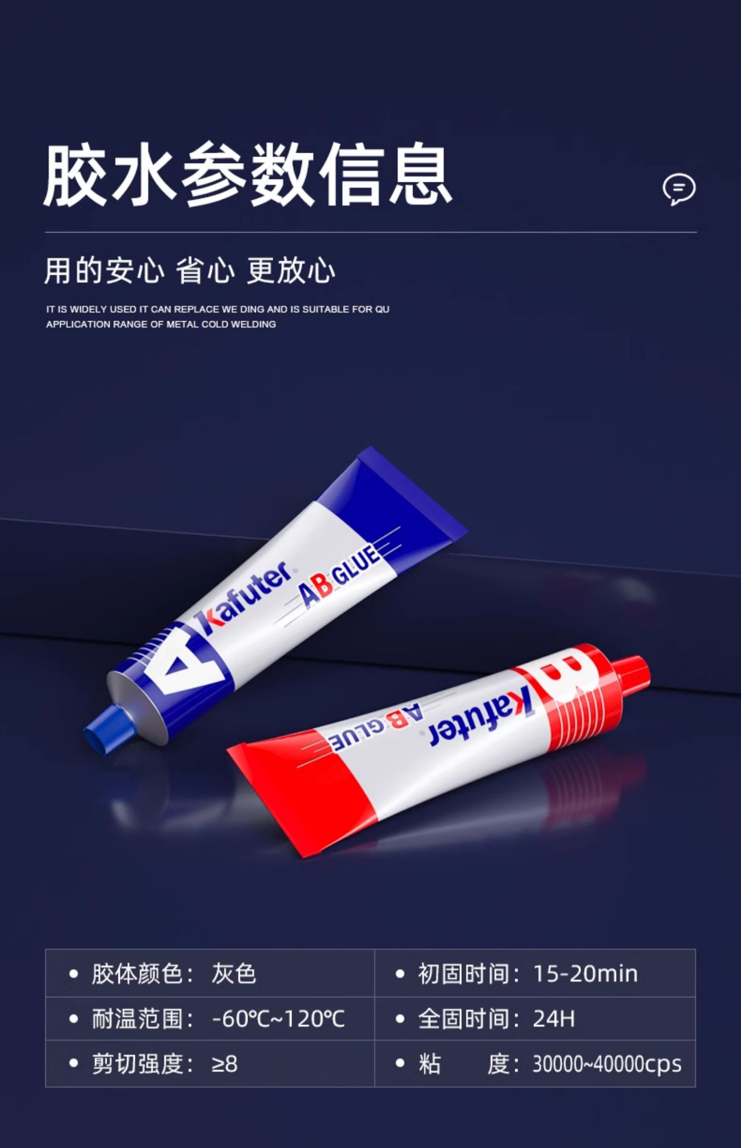 卡夫特K-964特种金属焊接胶金属AB胶低气味快固型粘接剂高强度50gK-964特种金属焊接胶K-964为常温固化型双组分环氧胶,其在常温情况下不但固化速度快,而且在-20C的温度条件下也可完全固化。由于其粘接强度高,耐水、耐油、耐弱碱、耐酸及耐溶剂和化学品,性能优良,因此可普遍用于金属和非金属材料的自粘或互粘,用于硬质材料的粘接和修补,建筑材料粘接、汽车零件、电子元件的组装,家庭日常修补及维修。卡夫特Kafuter官方授权经销商-东莞德润密封材料有限公司www.gzderun.com,销售服务热线:15817734885,李经理