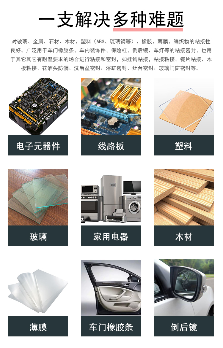 2、 工程塑料、金属、玻璃和陶瓷等物体粘接、密封。
