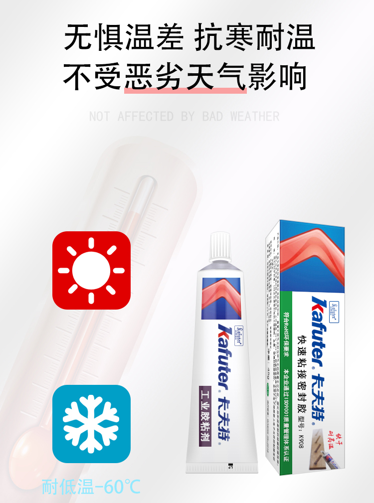 卡夫特K908快速粘接密封胶是一种可进行快速粘接的有机硅胶粘剂,绝缘性优、粘接性好,防潮、抗震、耐电晕、抗漏电。胶料对金属和大多数塑料的粘接性良好,固化后具有卓越的抗冷热交变性能(-60~200℃)。