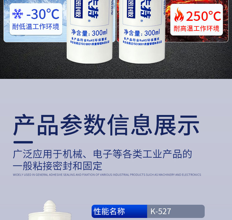 K-527(室温固化硅橡胶)是一种酮肟型单组分RTV型硅橡胶,高粘度、触变性好、中性无腐蚀,具有耐高温、高压、耐溶剂、低收缩、无塌陷等特性。适用于大间隙(0~6mm)的粘合密封,可防水、防油、抗冲击、振动。产品有蓝色,红色,黑色,灰色,白色可供选择。卡夫特Kafuter官方授权经销商-东莞德润密封材料有限公司www.gzderun.com,销售服务热线:15817734885,李经理