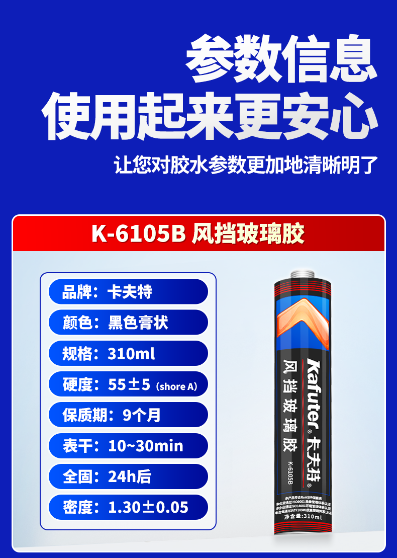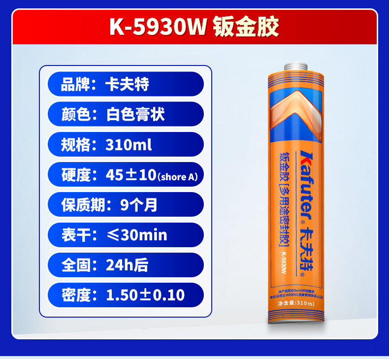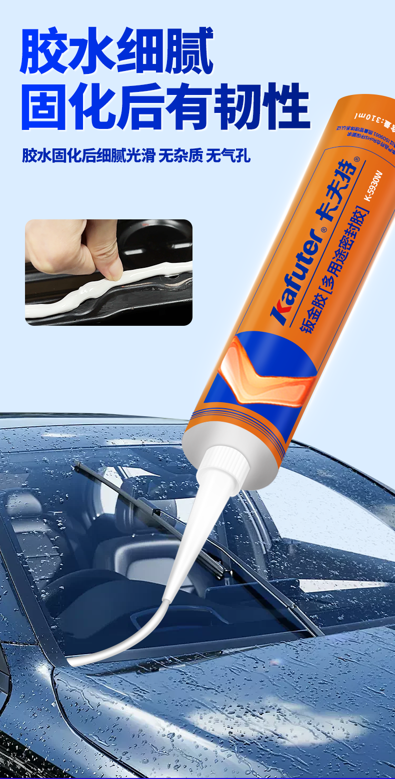 本产品为室温湿气固化型单组份多用途密封胶,与空气中的微量水分反应后固化,无需使用光、热等硬化设备。具有无溶剂、可立面涂敷、施工方便、固化速度快,固化后耐振动疲劳、表面可涂漆和涂料等优点。与玻璃、金属、木材、漆面等多种基材粘接性佳。卡夫特Kafuter官方授权经销商-东莞德润密封材料有限公司www.gzderun.com,销售服务热线:15817734885,李经理