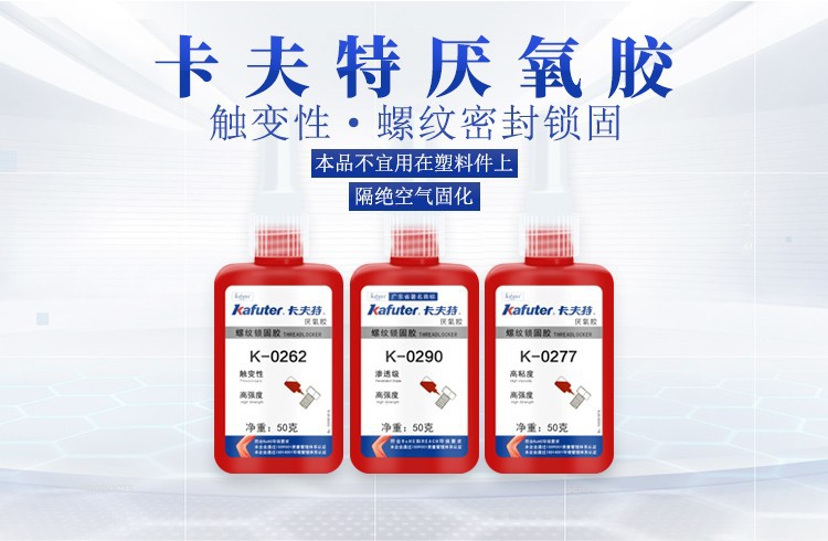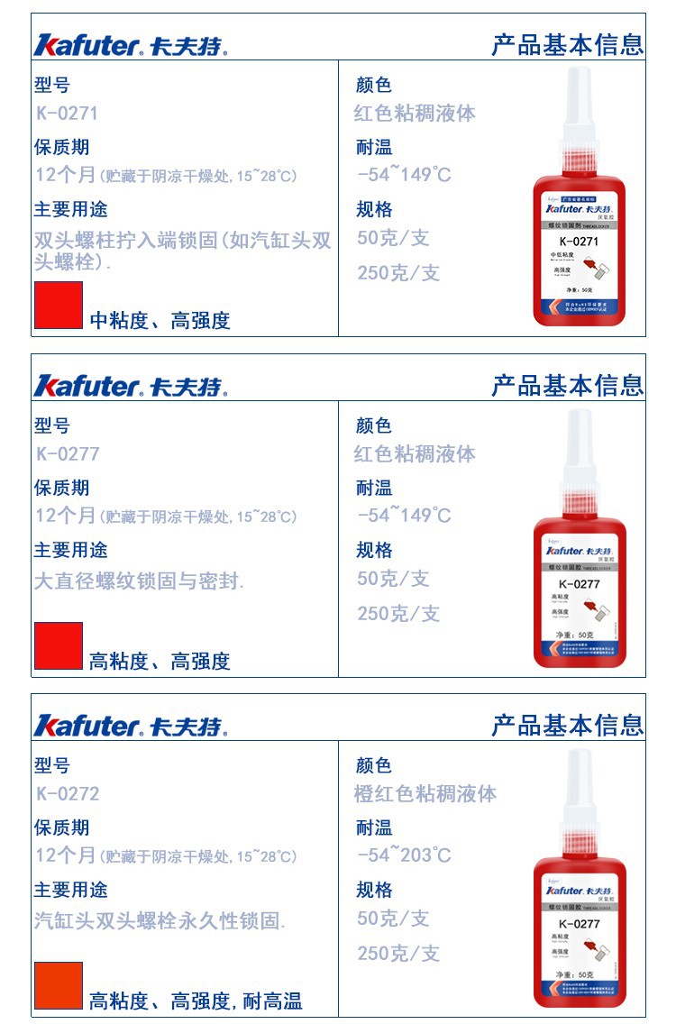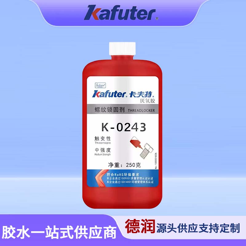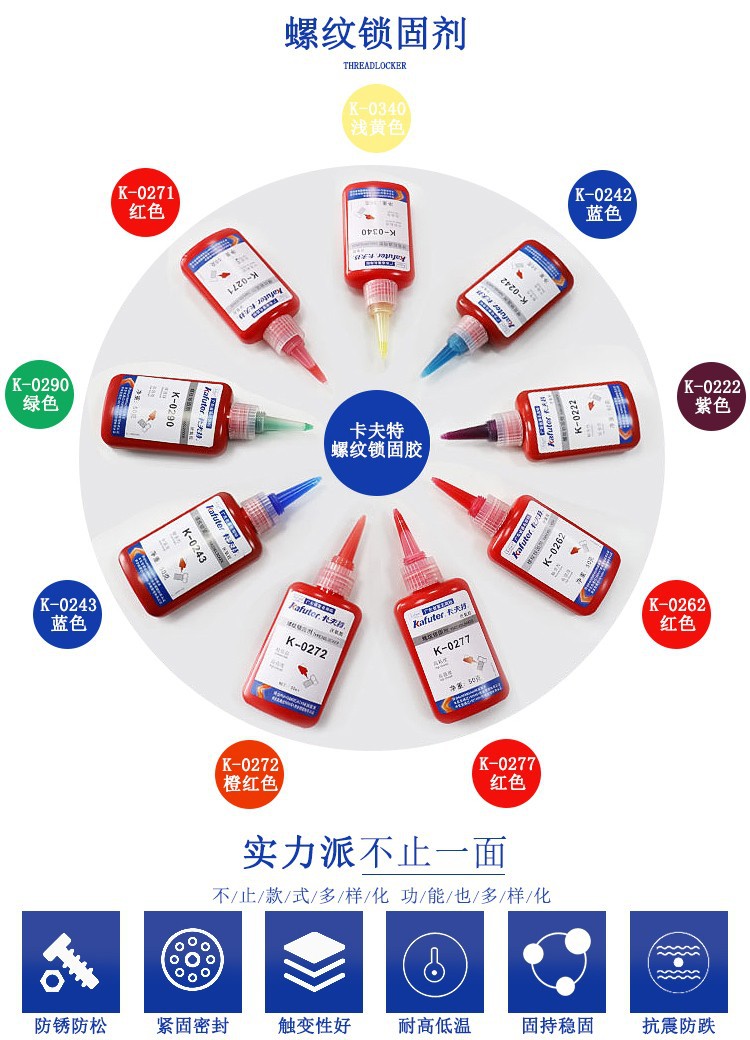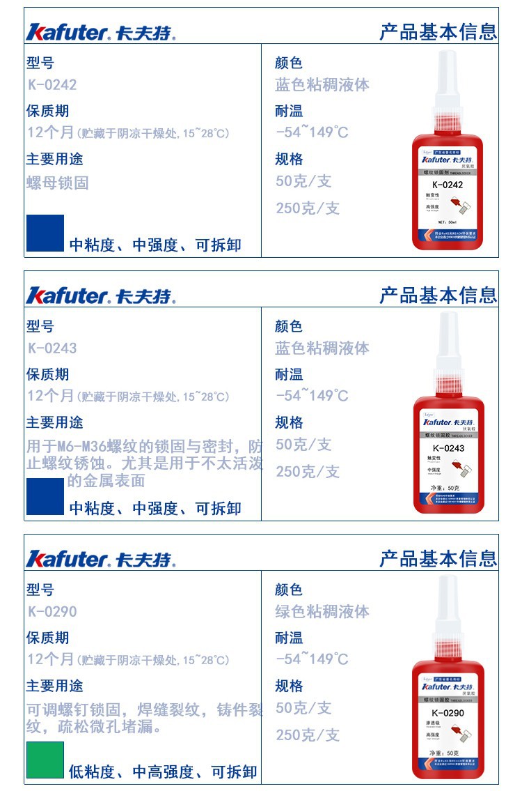 K-0243高活性中强度螺纹锁固密封剂K-0243是一种单组分、触变性中粘度、中强度、高活性厌氧型螺纹锁固密封剂。本品用于两个紧密配合的金属表面间,与空气隔绝时固化,可以防止由于震动或中击而引起的松动或泄漏,可用手工工具拆卸。用于M6-M36螺纹的锁固与密封,尤其是用于不太活泼的金属表面,例如不锈钢或镀层表面这些需要进行手工工具拆卸的地方。典型用途:螺母锁固。卡夫特Kafuter官方授权经销商-东莞德润密封材料有限公司www.gzderun.com,销售服务热线:15817734885,李经理
