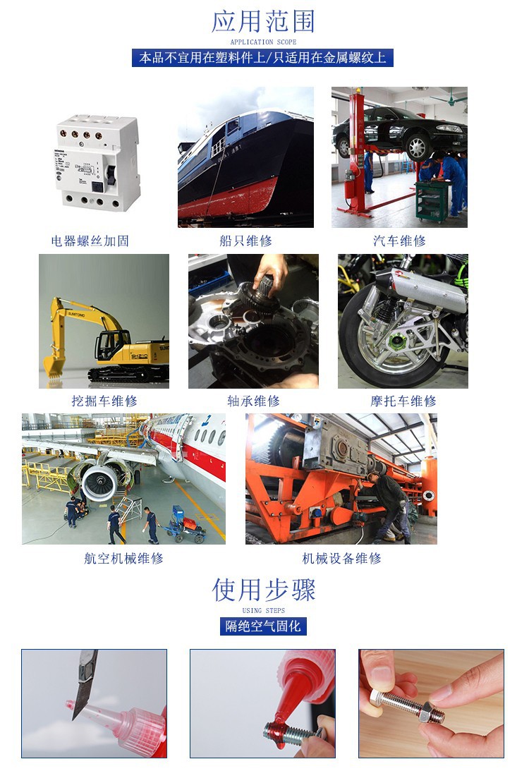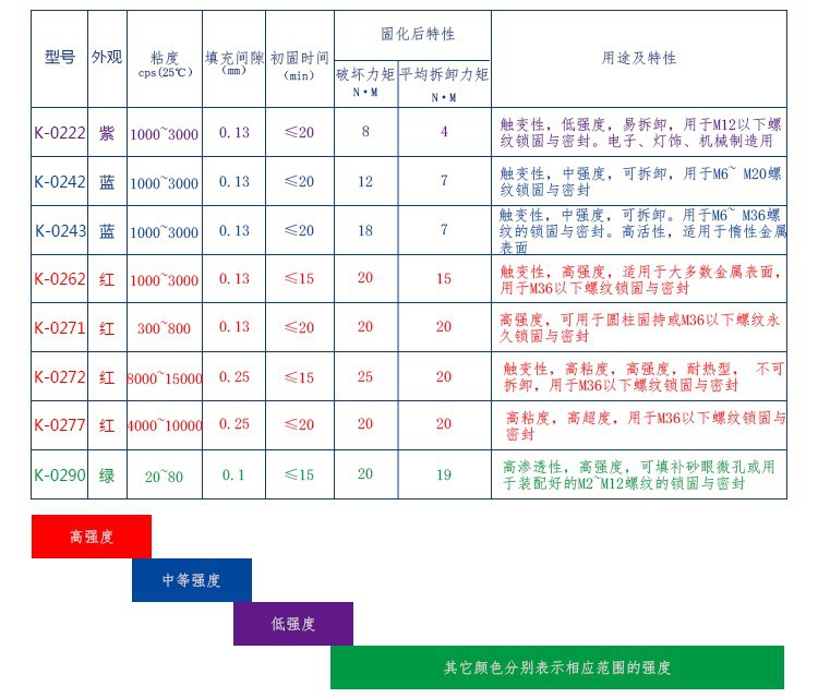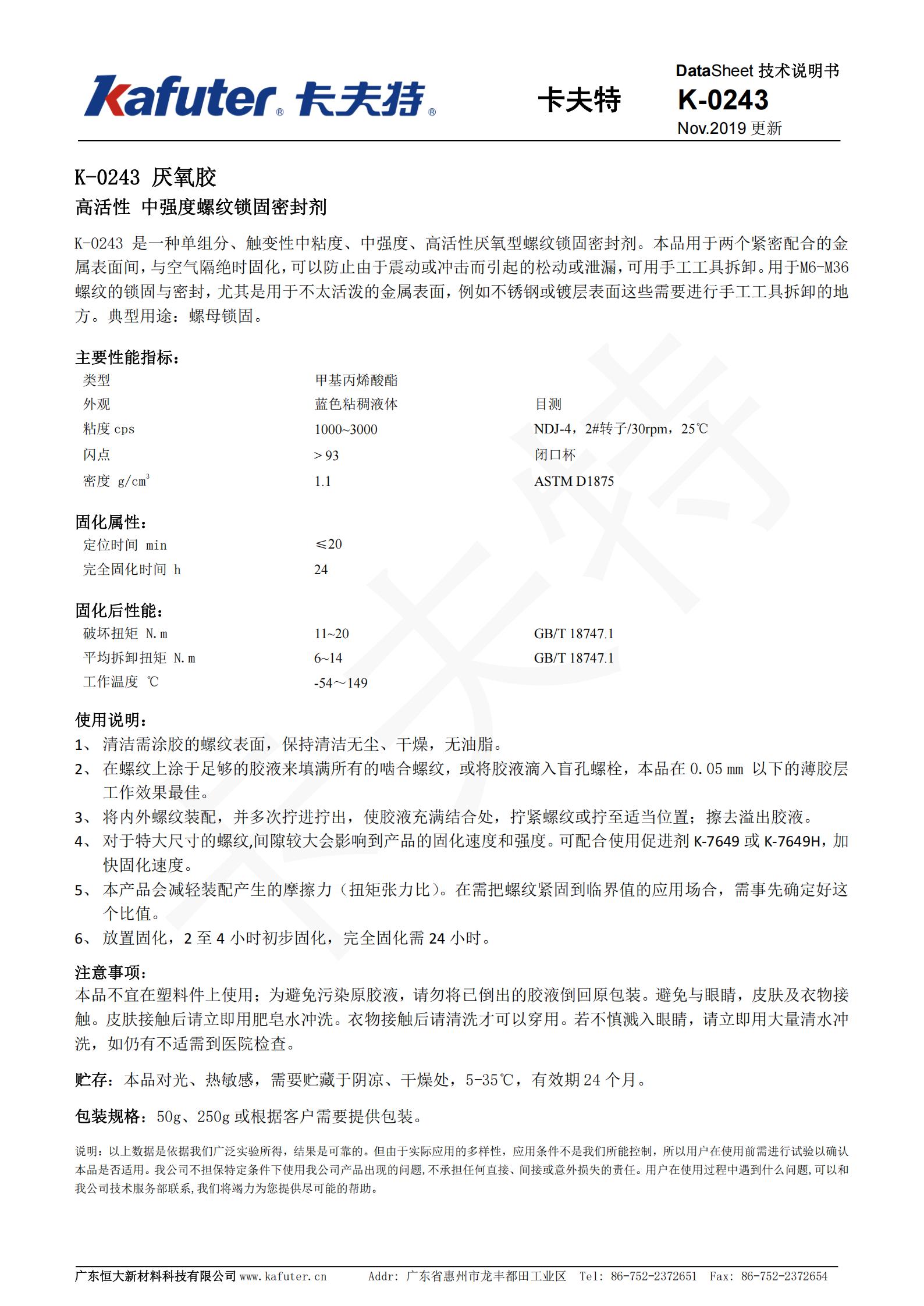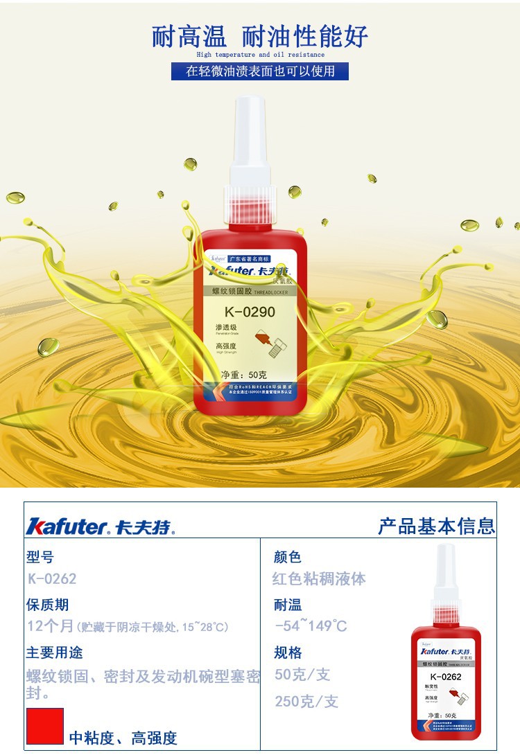 K-0243高活性中强度螺纹锁固密封剂K-0243是一种单组分、触变性中粘度、中强度、高活性厌氧型螺纹锁固密封剂。本品用于两个紧密配合的金属表面间,与空气隔绝时固化,可以防止由于震动或中击而引起的松动或泄漏,可用手工工具拆卸。用于M6-M36螺纹的锁固与密封,尤其是用于不太活泼的金属表面,例如不锈钢或镀层表面这些需要进行手工工具拆卸的地方。典型用途:螺母锁固。卡夫特Kafuter官方授权经销商-东莞德润密封材料有限公司www.gzderun.com,销售服务热线:15817734885,李经理