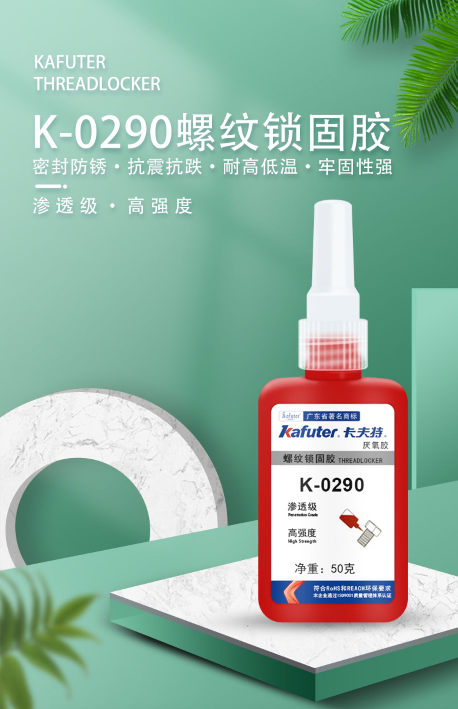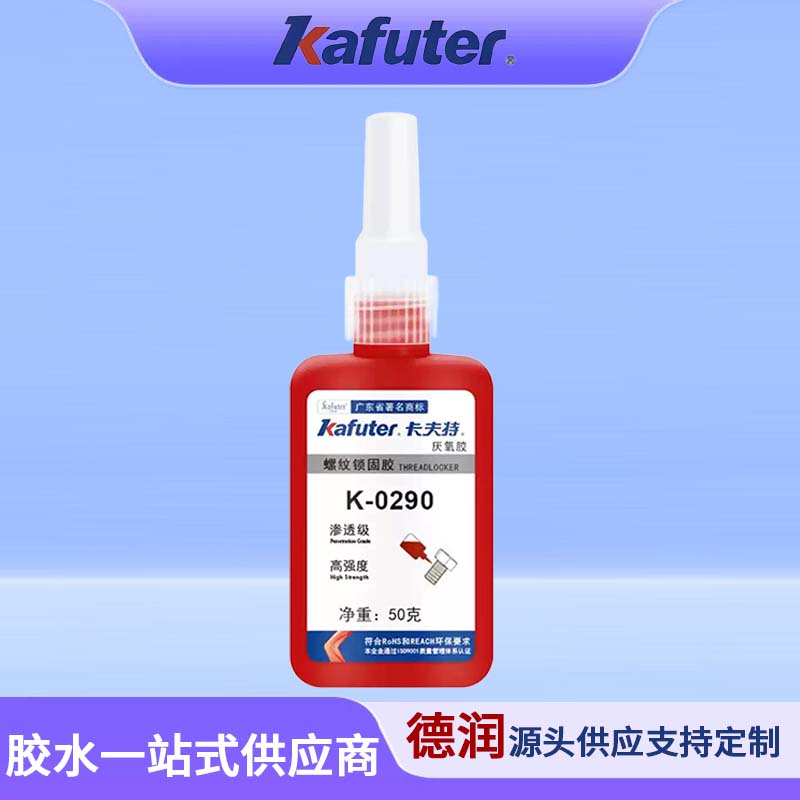 K-0290是一种单组分、低粘度、中高强度、高渗透性厌氧型螺纹锁固密封剂。本品用于两个紧密配合的金属表面间,与空气隔绝时固化,可避免螺纹紧固件的松动和渗漏。用于M12以下已装配好的螺纹紧固件锁固与密封,防止螺纹锈蚀。典型用途:可调螺钉锁固,焊缝裂纹,铸件裂纹,疏松微孔堵漏。卡夫特Kafuter官方授权经销商-东莞德润密封材料有限公司