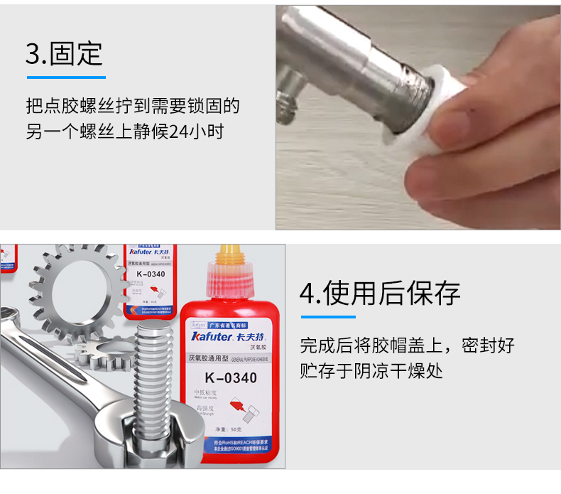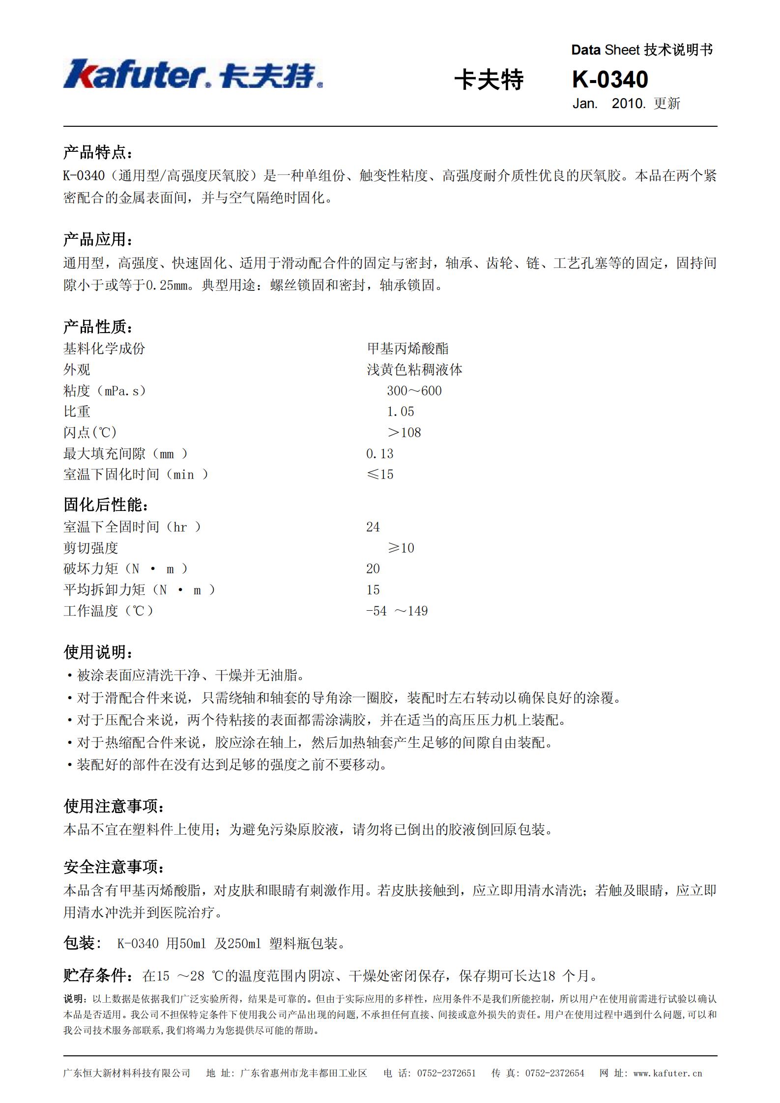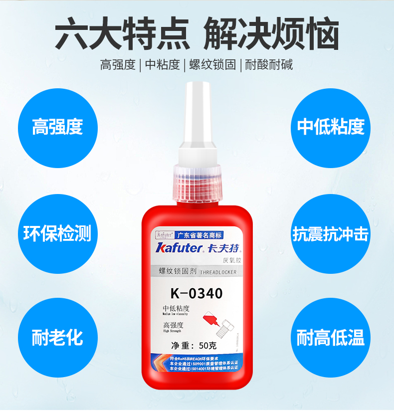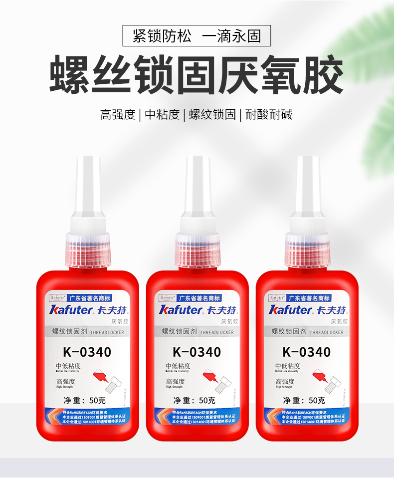 K-0340是一种单组分、触变性粘度、高强度耐介质性优良的厌氧胶。本品在两个紧密配合的金属表面间,并与空气隔绝时固化。典型用途:通用型,中等粘度、高强度、快速固化、适用于螺纹的锁固与密封,轴承、齿轮、链、工艺孔塞等的固定,固持间隙小于或等于0.13mm。典型用途:螺丝锁固和密封,轴承固定。卡夫特Kafuter官方授权经销商-东莞德润密封材料有限公司