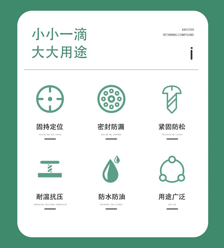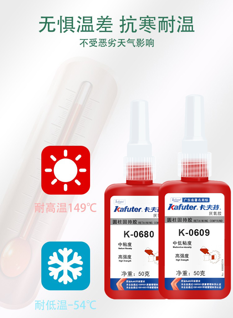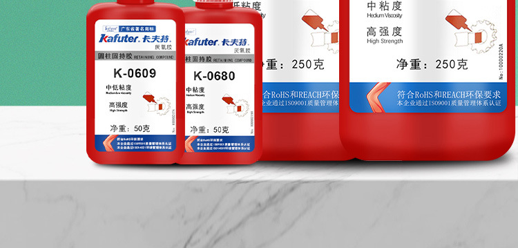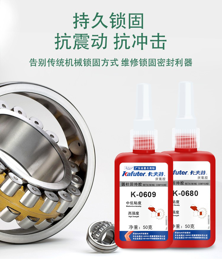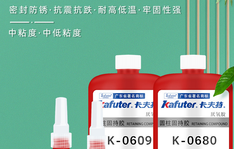 K-0648属单组分、高强度、耐高温、快速固化厌氧型圆柱体孔/轴配合件固持胶。本品用于两个紧密配合的金属之间,与空气隔绝时固化。典型用途:最高强度的耐高温固持胶。用于动态负荷工况或周期性载荷的工况下。耐高温、快速固化,用于固持配合间隙<0.15mm孔/轴配合。卡夫特Kafuter官方授权经销商-东莞德润密封材料有限公司