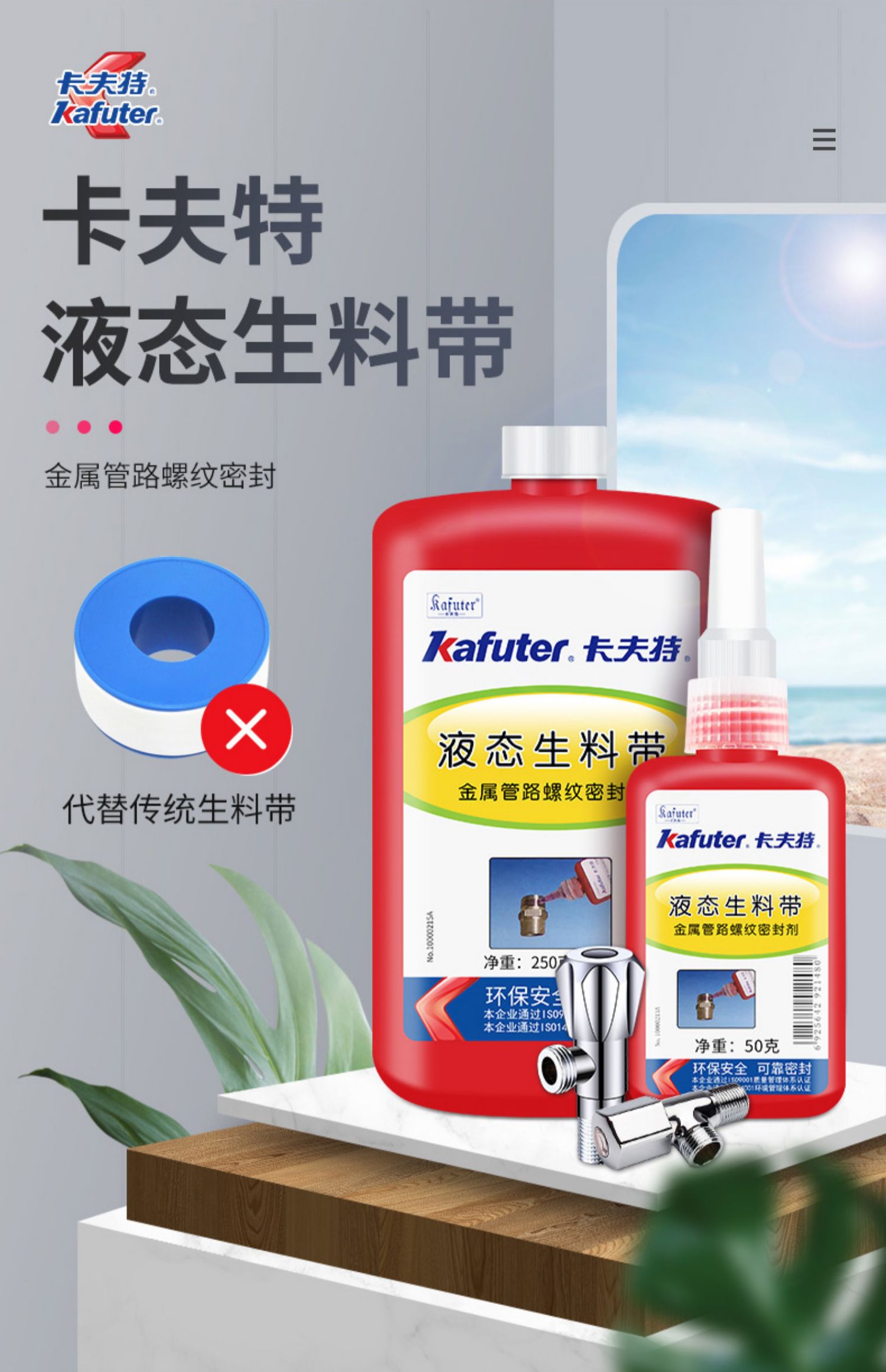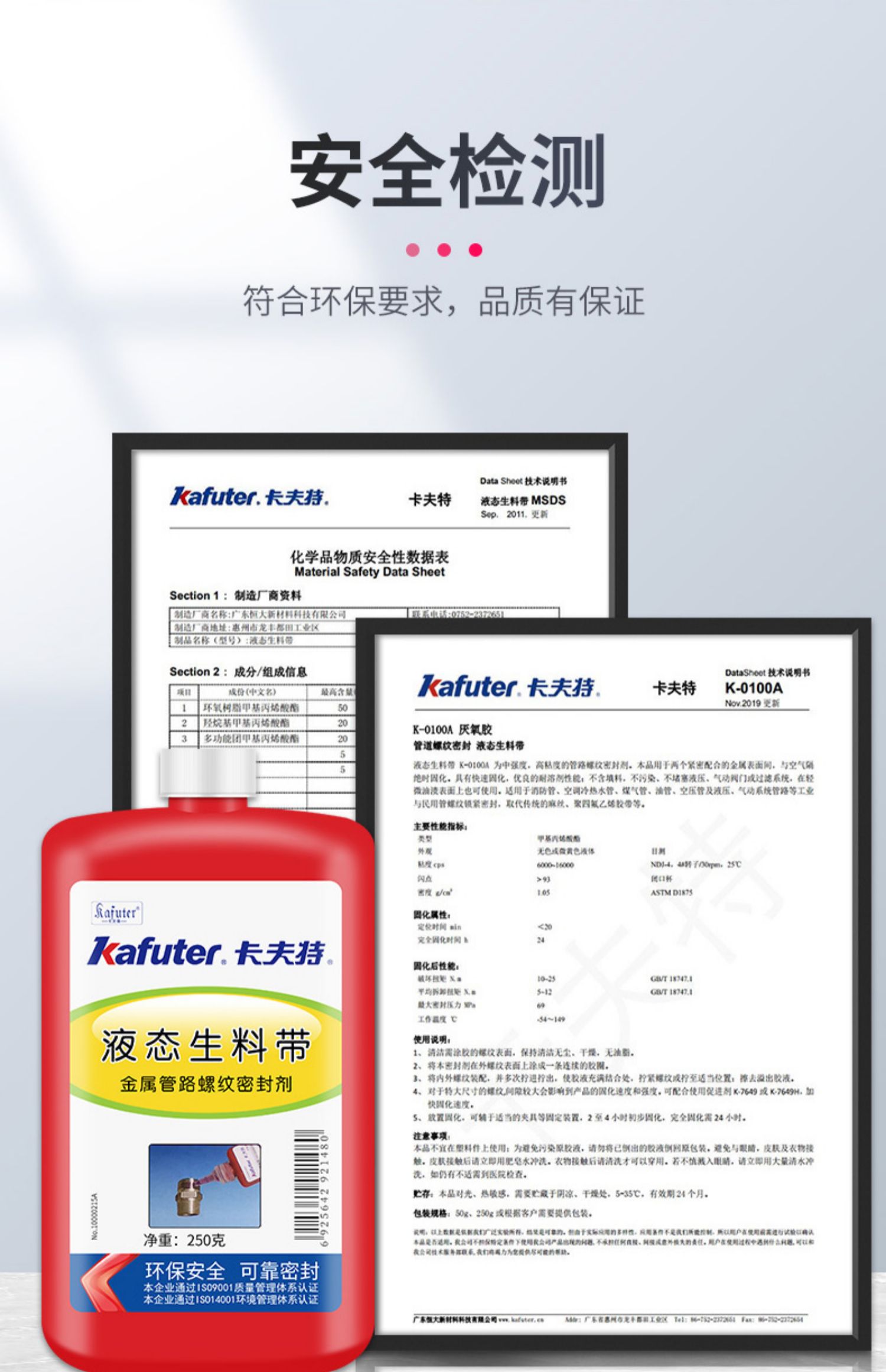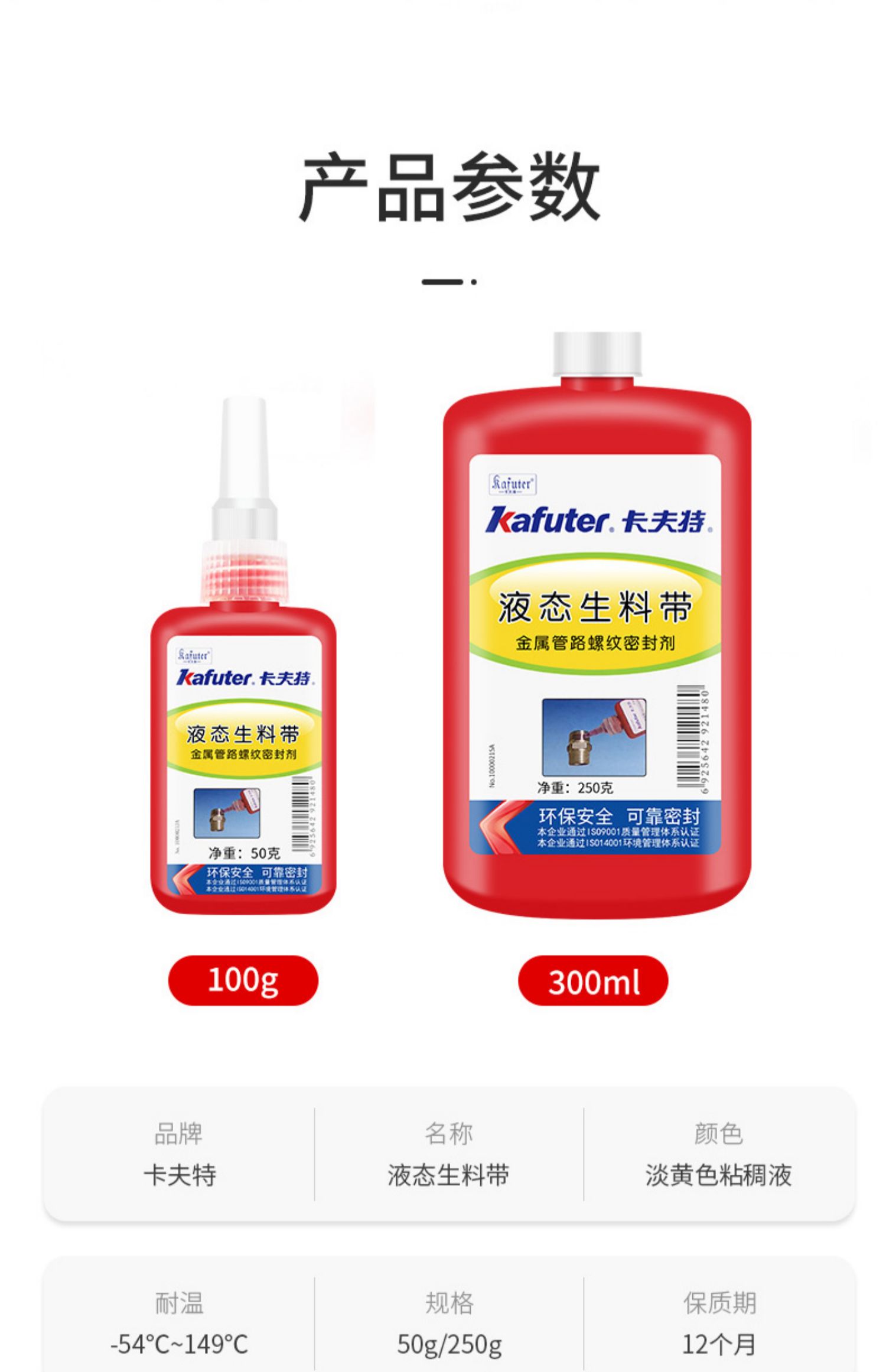 卡夫特K-0100A液态生料带(液压。气动系统管路接头密封剂)为中强度,中粘度,的管路螺纹密封挤剂。本品在两个紧密配合的金属表面间,并与空气隔绝时固化。卡夫特Kafuter官方授权经销商-东莞德润密封材料有限公司