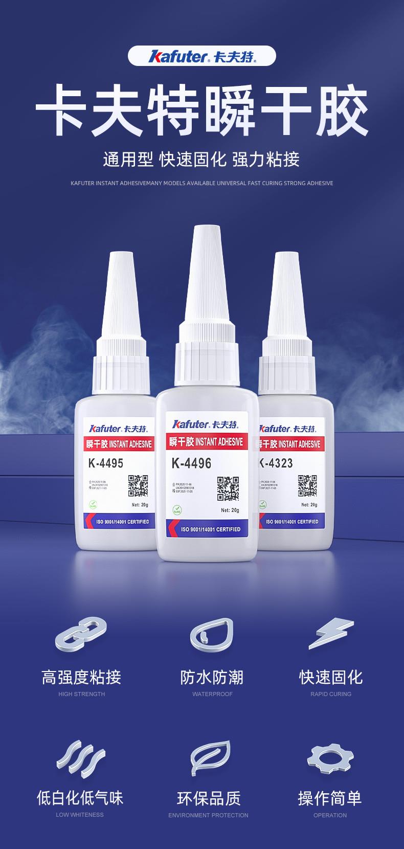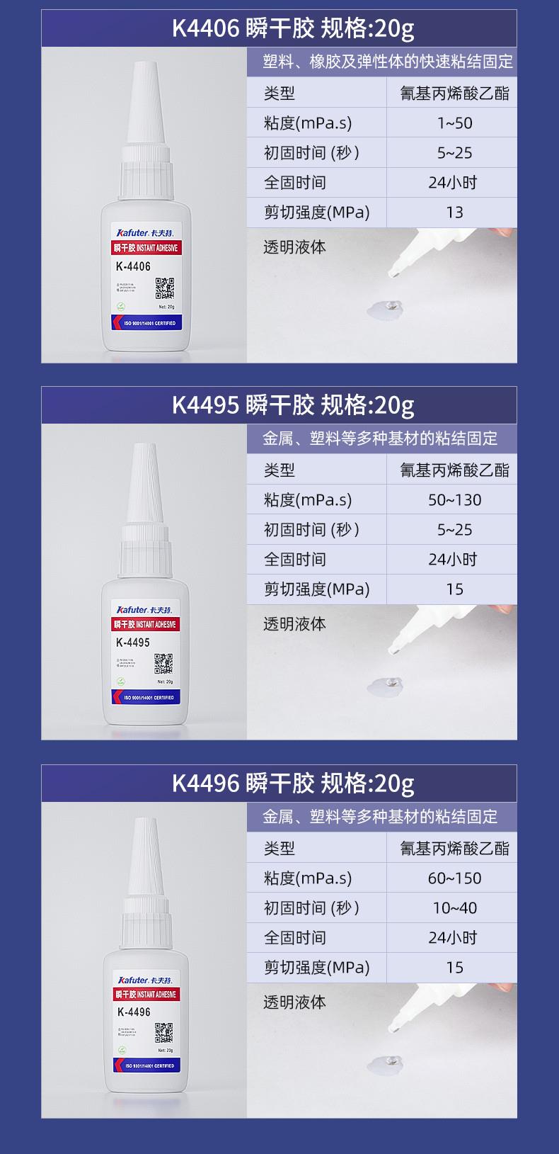 K-4401是一种低粘度快速瞬间强力胶,主要用于金属、橡胶、塑料、木材、织物和纸张的粘接。卡夫特Kafuter官方授权经销商-东莞德润密封材料有限公司