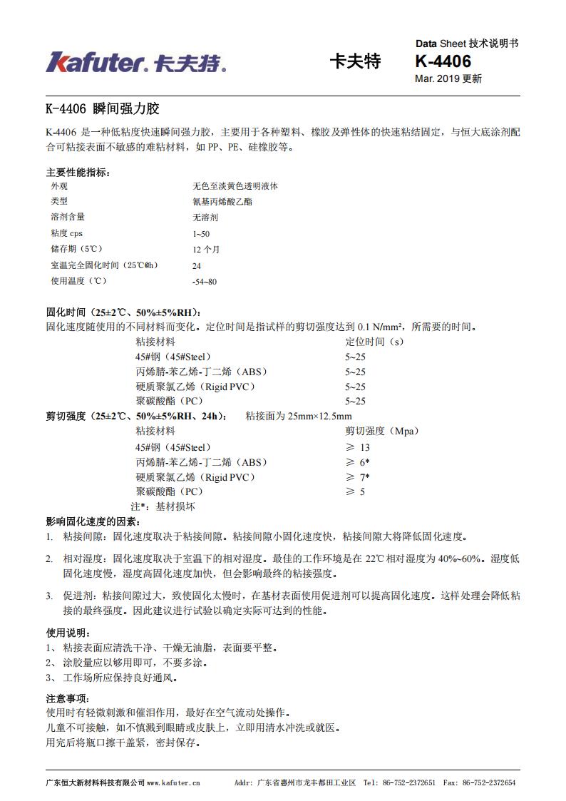 K-4406是一种低粘度快速瞬间强力胶,主要用于各种塑料、橡胶及弹性体的快速粘结固定,与恒大底涂剂配合可粘接表面不敏感的难粘材料,如PP、PE、硅橡胶等。卡夫特Kafuter官方授权经销商-东莞德润密封材料有限公司