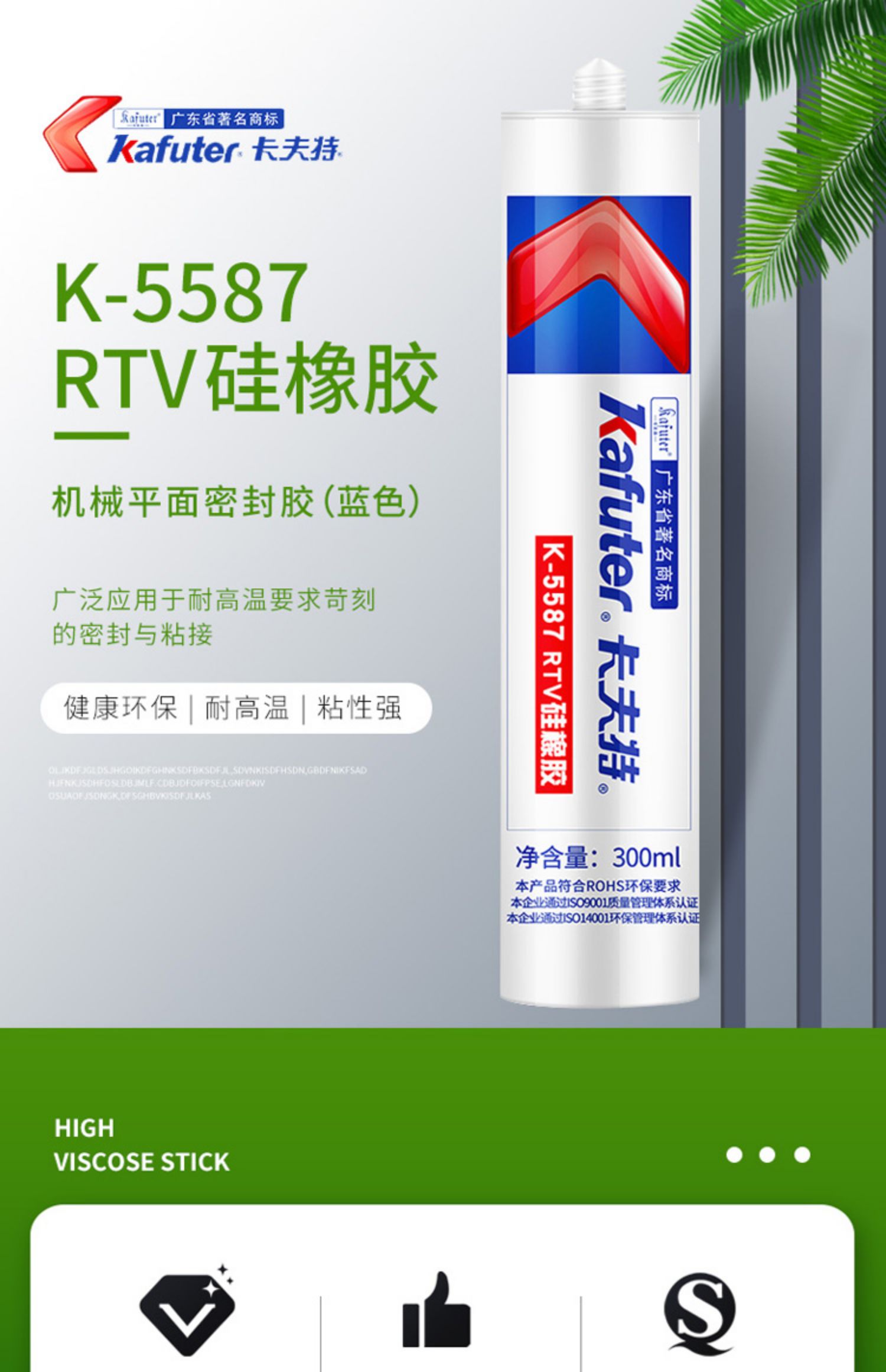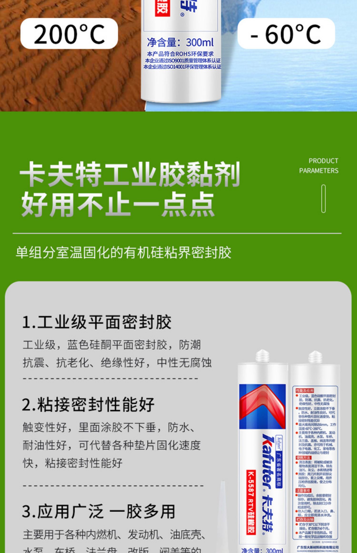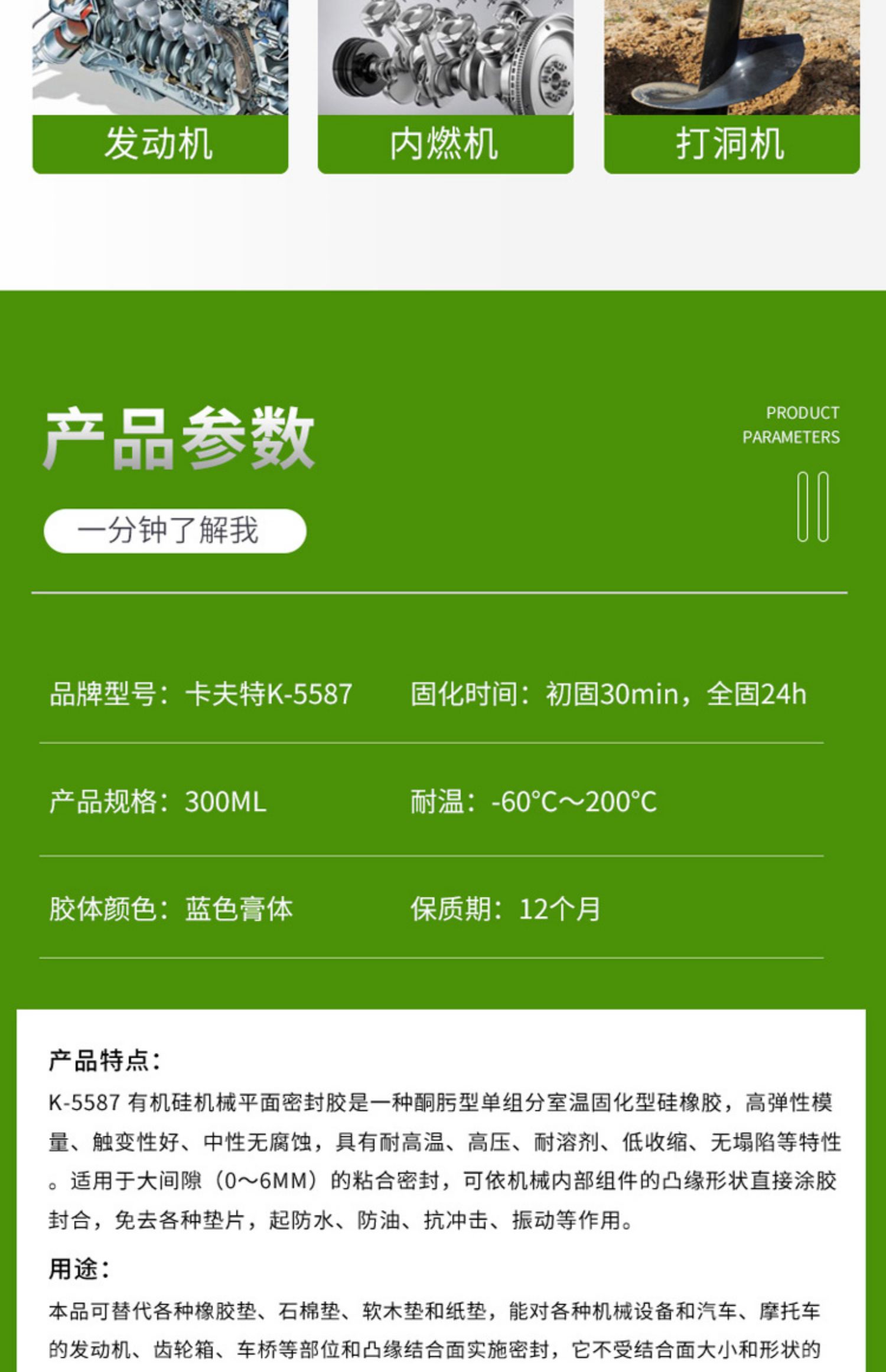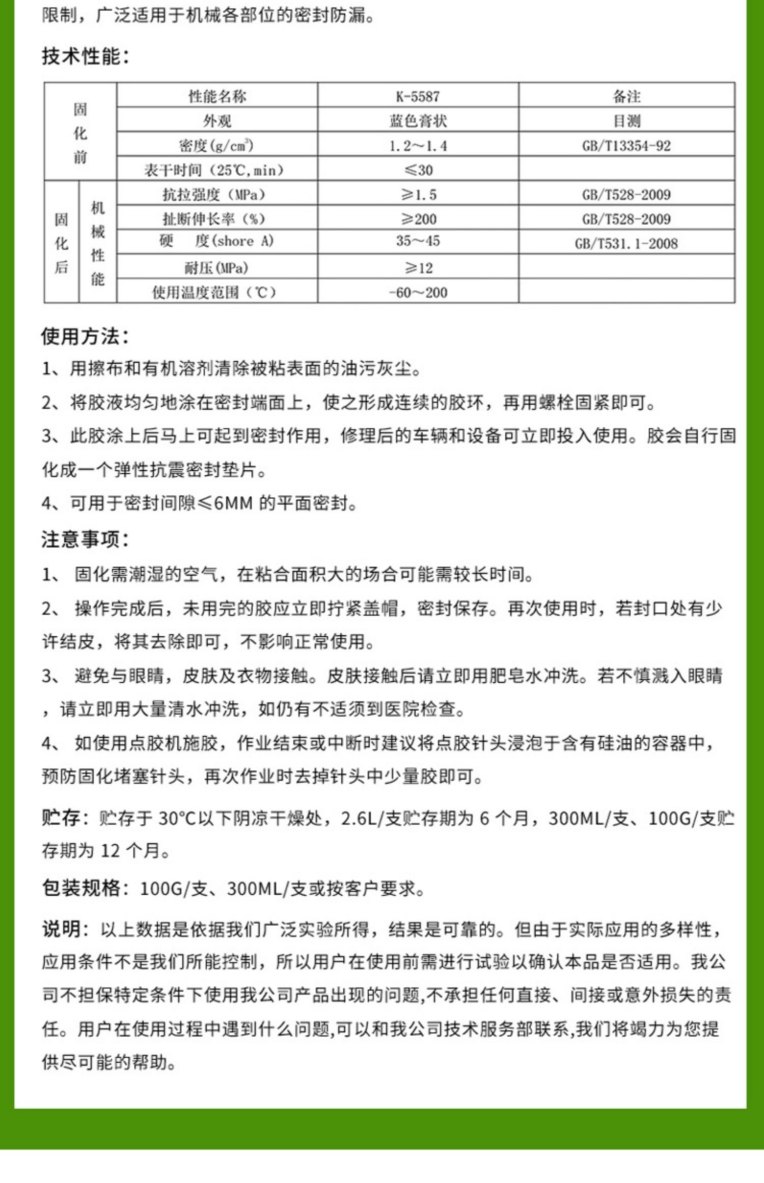 卡夫特5587可替代各种橡胶垫、石棉垫、软木垫和纸垫,能对各种机械设备和汽车、摩托车的发动机、齿轮箱、车桥等部位和凸缘结合面实施密封,它不受结合面大小和形状的限制,广泛适用于机械各部位的密封防漏。卡夫特Kafuter官方授权经销商-东莞德润密封材料有限公司