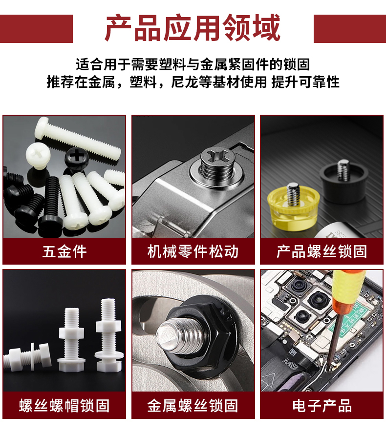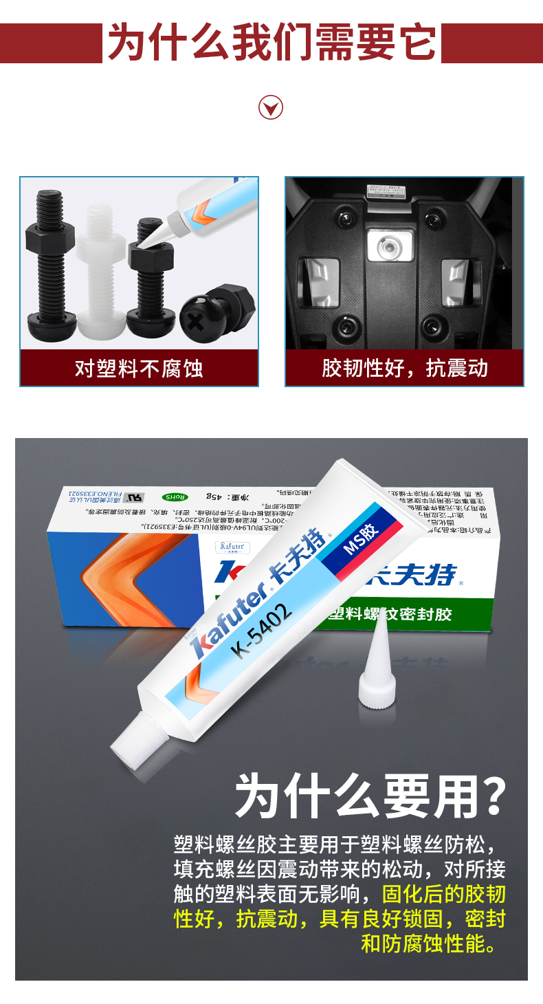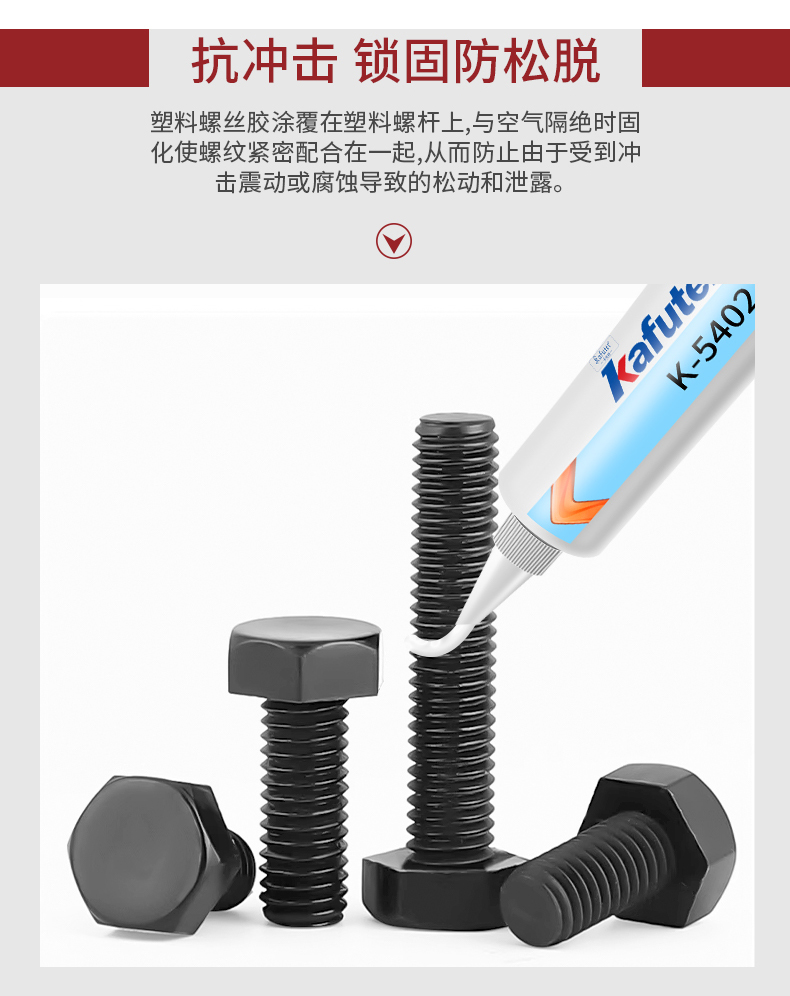 K-5402是一种单组份、低强度、高韧性的改性MS塑料材料用螺纹密封剂。本品适用于望料螺丝的粘接和密封,对塑料无腐蚀性,对瓷、金属、玻璃、PVC、PC、ABs、环氧、尼龙等有良好的粘接性能。同时具有环保无害、无味、无污染、防腐蚀、防老化,电绝缘性等特