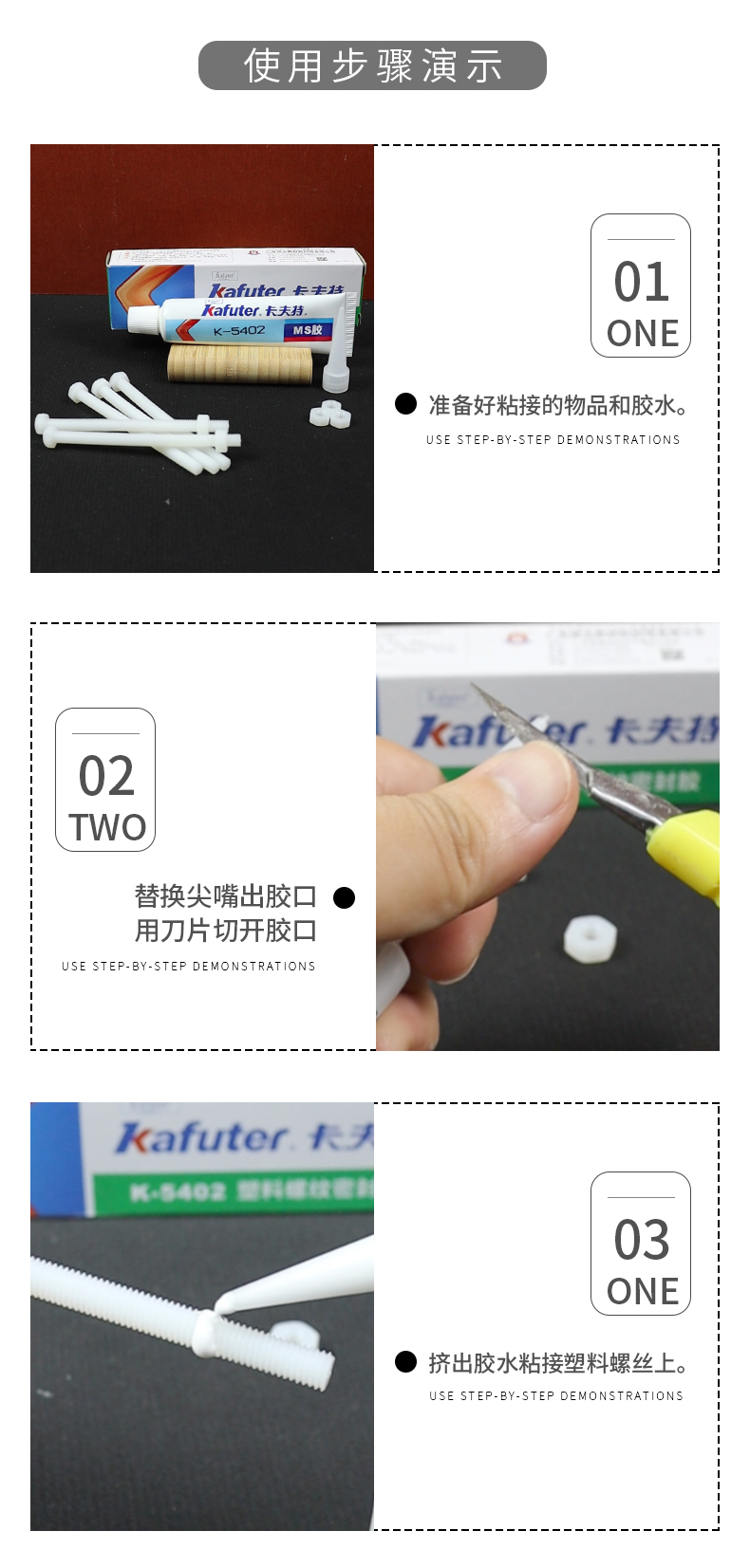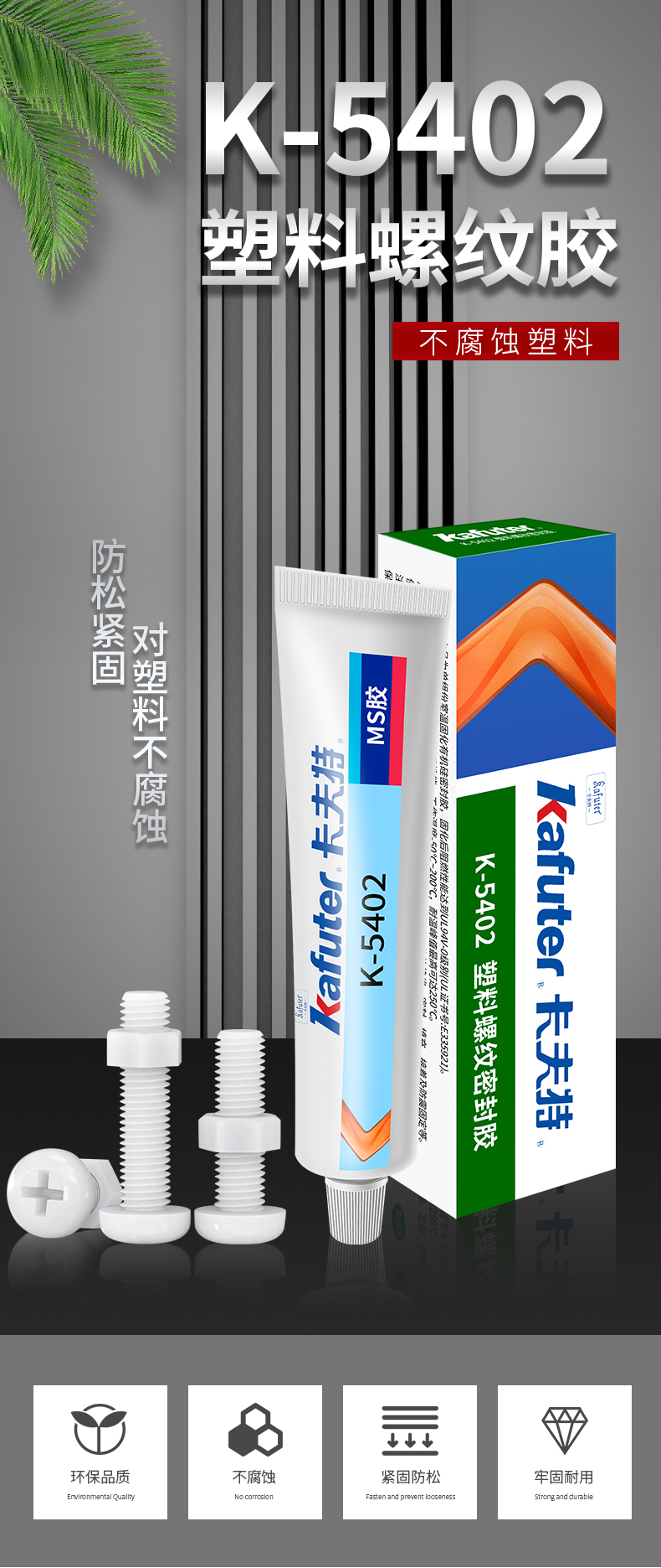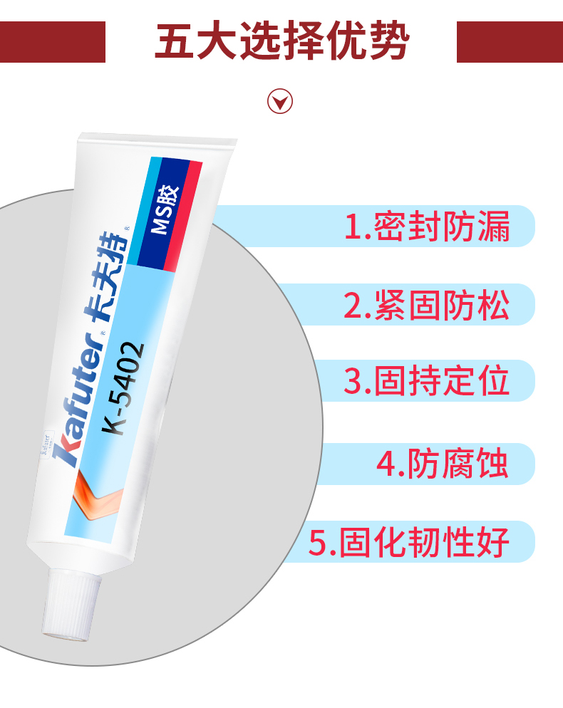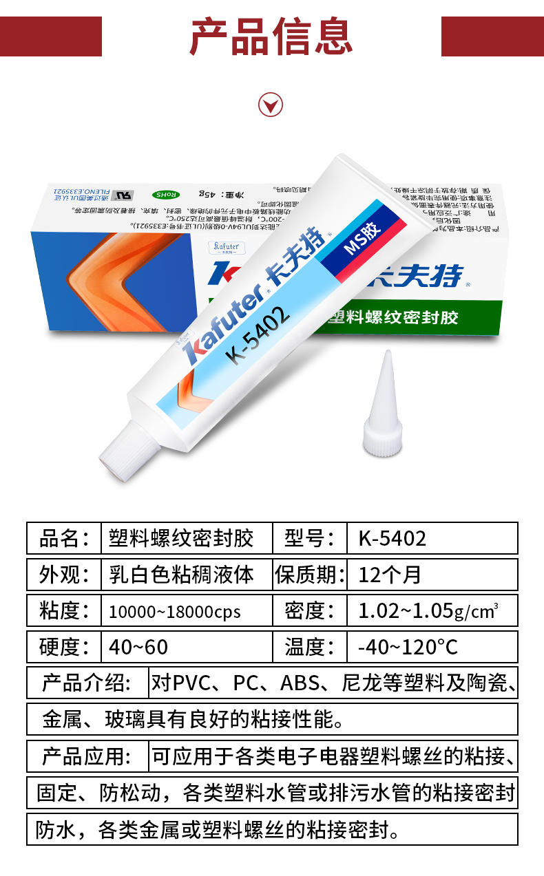 K-5402是一种单组份、低强度、高韧性的改性MS塑料材料用螺纹密封剂。本品适用于塑料螺丝的粘接和密封,对塑料无腐蚀性,对陶瓷、金属、玻璃、PVC、PC、ABS、环氧、尼龙等有良好的粘接性能。同时具有环保无害、无味,无污染、防腐蚀、防老化等特性。卡夫特Kafuter官方授权经销商-东莞德润密封材料有限公司www.gzderun.com,销售服务热线:15817734885,李经理