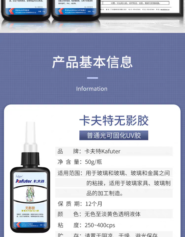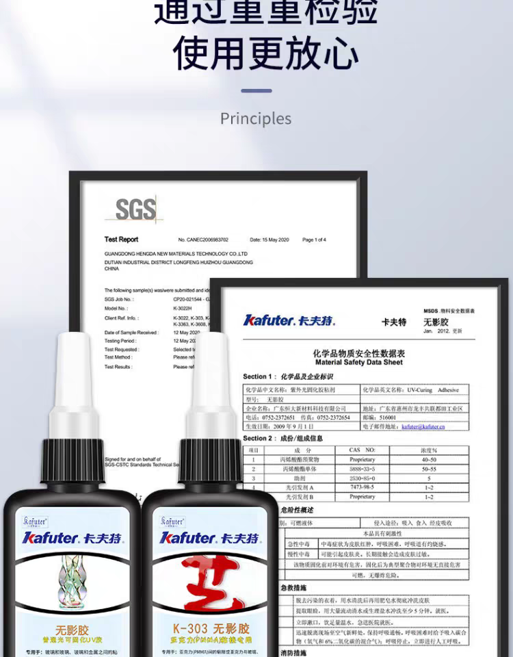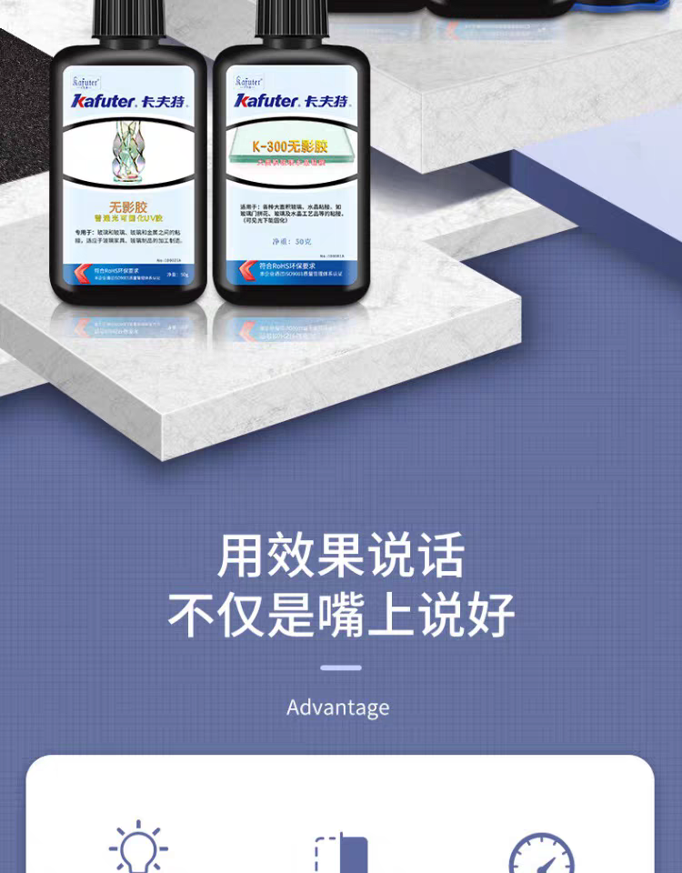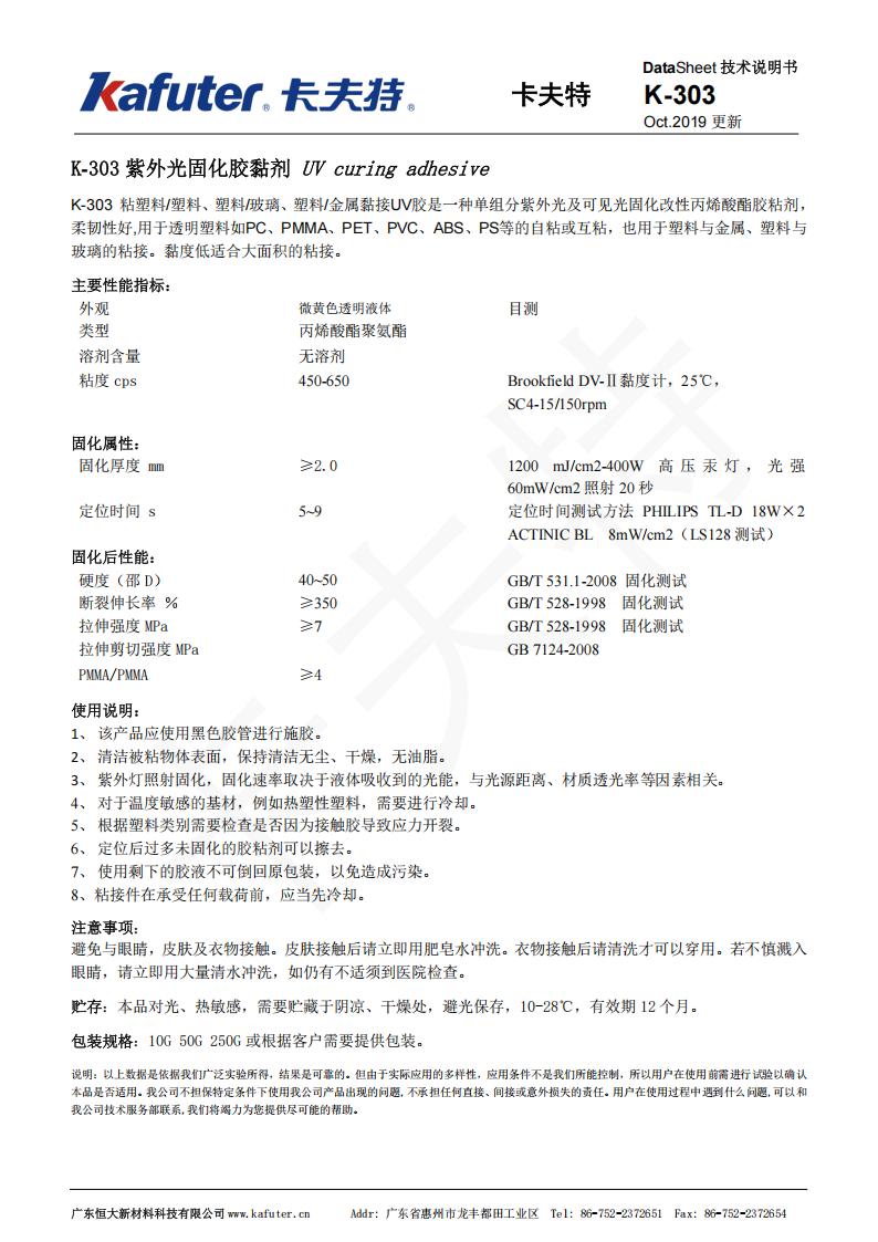 K-303粘塑料/塑料、塑料/玻璃、塑料/金属黏接UV胶是一种单组分紫外光及可见光固化改性丙烯酸酯胶粘剂,柔韧性好,用于透明塑料如PC、PMMA、PET、PVC、ABS、PS等的自粘或互粘,也用于塑料与金属、塑料与玻璃的粘接。黏卡夫特Kafuter官方授权经销商-东莞德润密封材料有限公司www.gzderun.com,销售服务热线:15817734885,李经理
