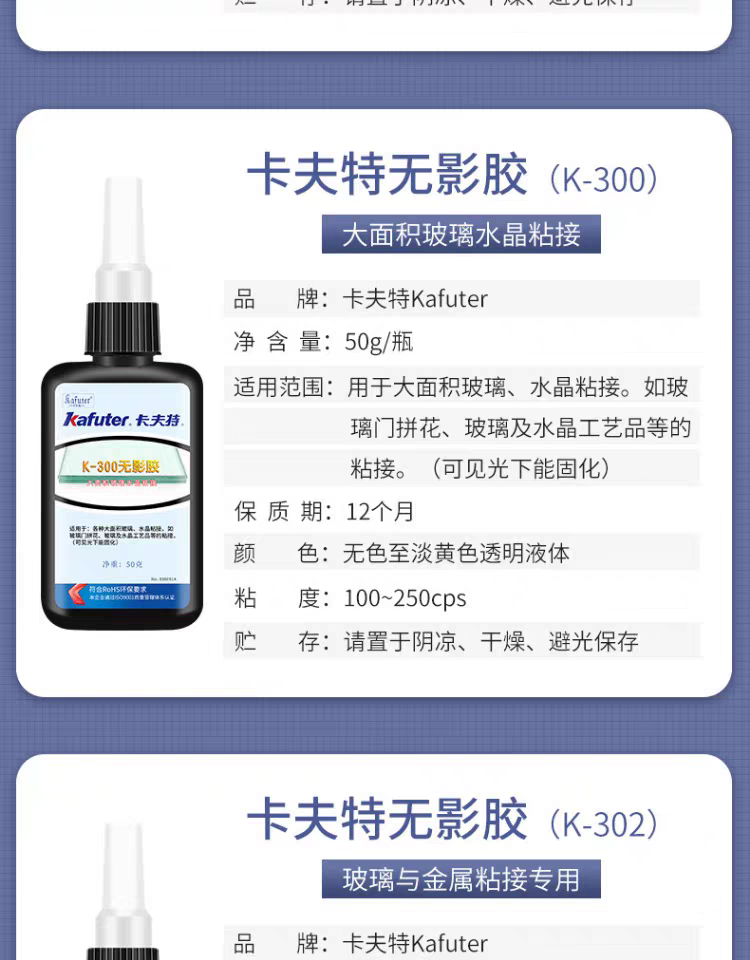 K-302是高强度抗冲击紫外光固化丙烯酸酯类胶黏剂。对玻璃、水晶和金属如铝、碳钢、不锈钢、镀锌钢板的粘接强度高,通用性佳,稳定性好。中低粘度,适用于玻璃对玻璃,玻璃对金属等小面积粘接。