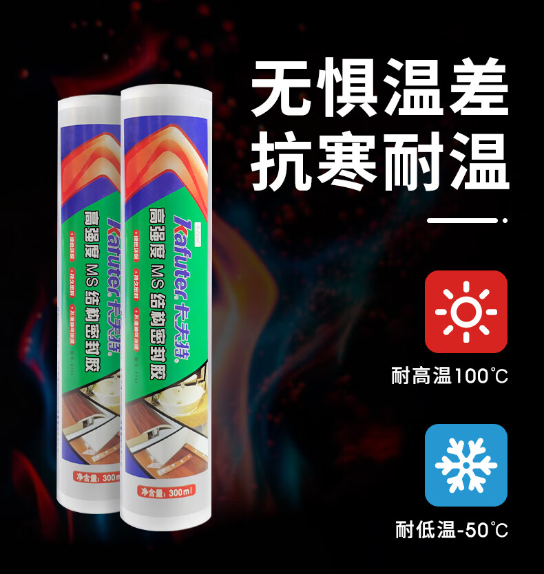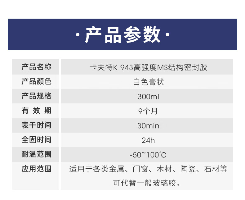 K-943高强度MS结构密封胶是一种单组分改性硅烷密封胶,与空气中的微量水分反应后快速固化,无需使用光、热等硬化设备,固化后表面可上漆和涂料。胶体无溶剂,初粘力好,不腐蚀产品外观。固化后具有良好的耐高低温性能(-40C~100C)。本产品适用范围广,对待玻璃、金属、漆面、木材、塑料等大部分粘接基材不要求做特殊表面处理便可获得优异的粘接效果。