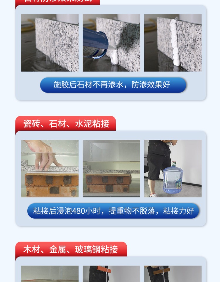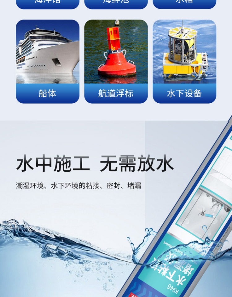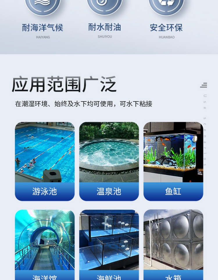 2. 在潮湿环境、 水中及水下均可使用, 对水体无污染, 对人畜、 鱼类无害。