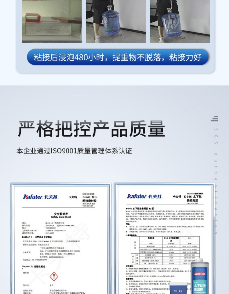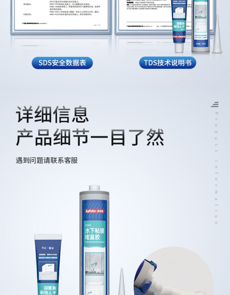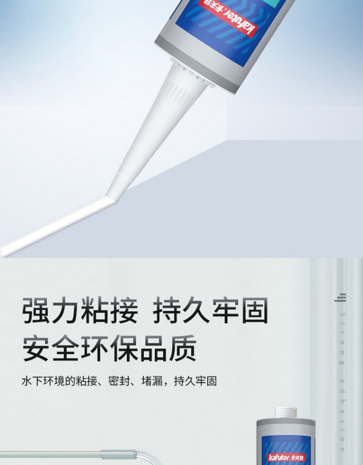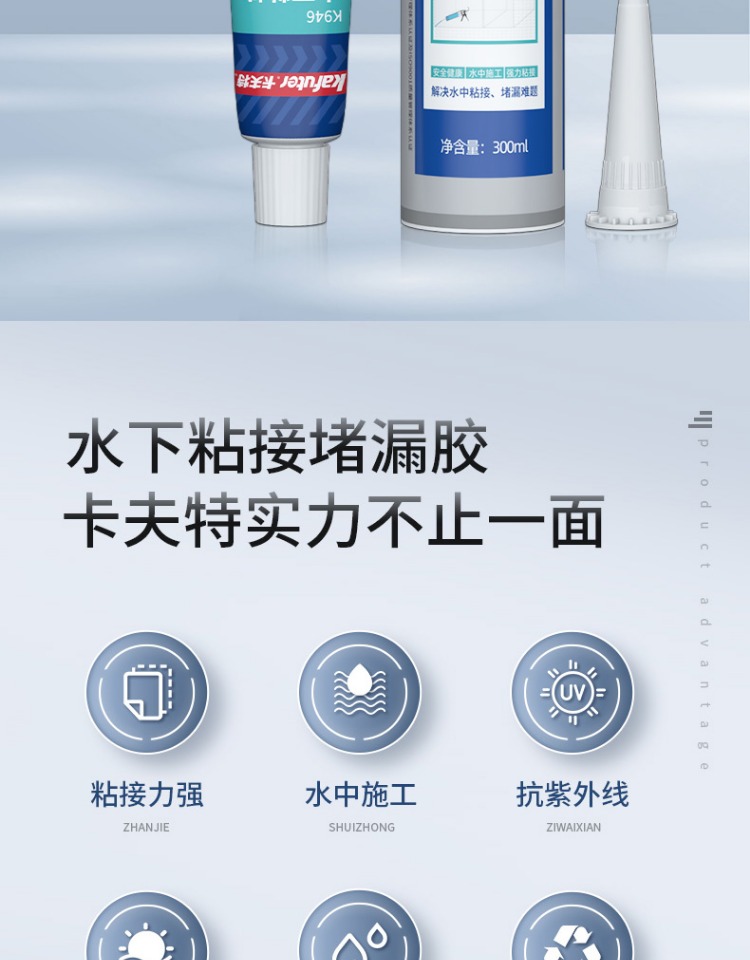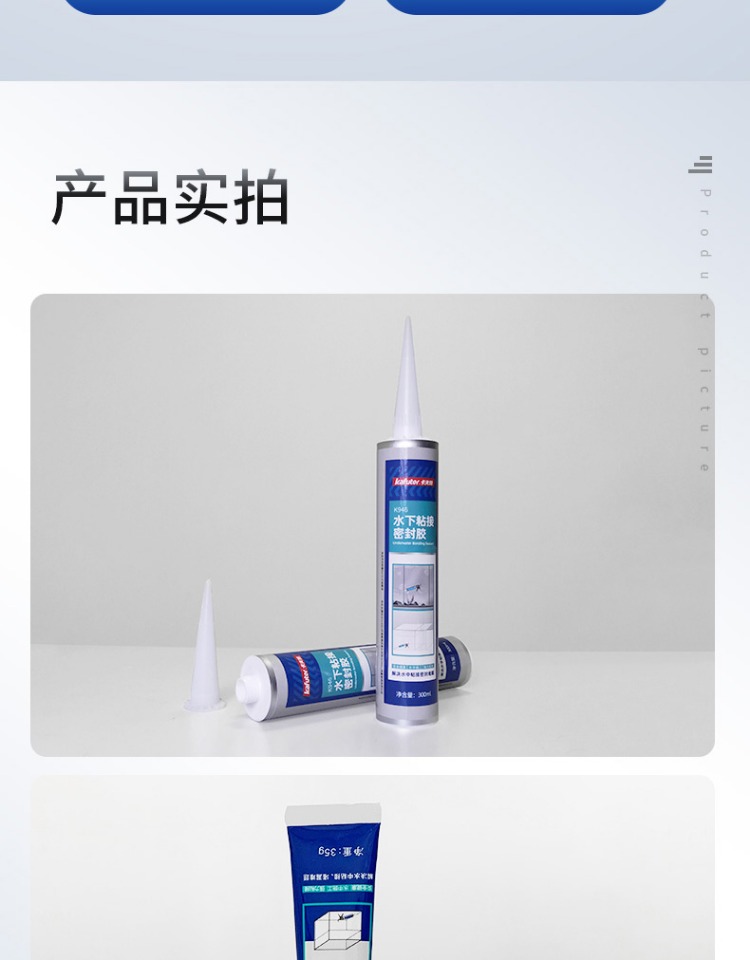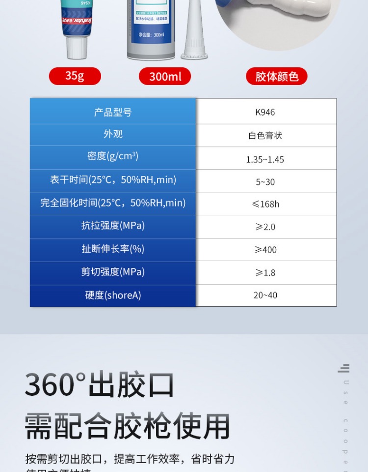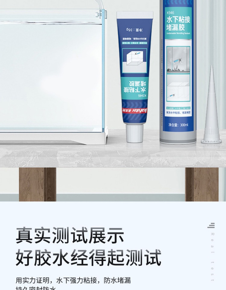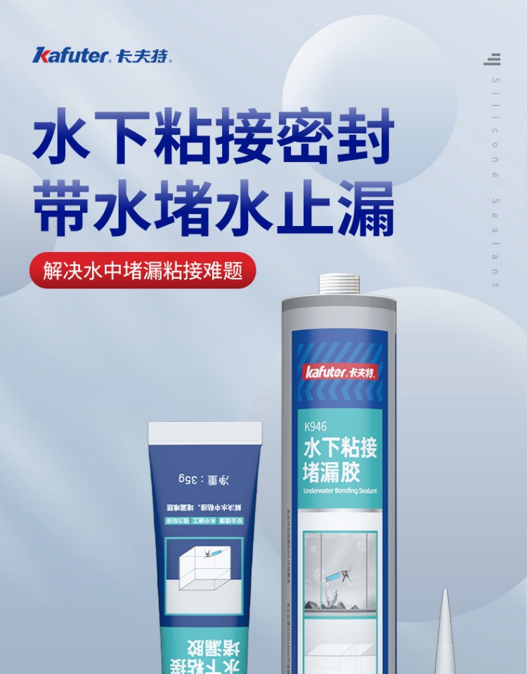 卡夫特K-946水下粘接密封胶是一种无溶剂类单组分湿气固化弹性粘合剂, 其主要成份为含有甲硅烷基的特殊改性硅烷。 与空气中的微量水分反应后硬化, 无需使用光、 热等硬化设备。 具有硅橡胶的优异耐老化性能与聚氨酯高强度的优点。 高性能,低 VOC,耐热,耐湿,耐候, 耐寒性好, 耐老化, 耐海洋气候, 操作容易; 粘接强度高, 不腐蚀产品外观,表面可上油漆及涂料。 适用范围广, 对待粘接基材不要求做特殊表面处理便可获得优异的粘接效果。