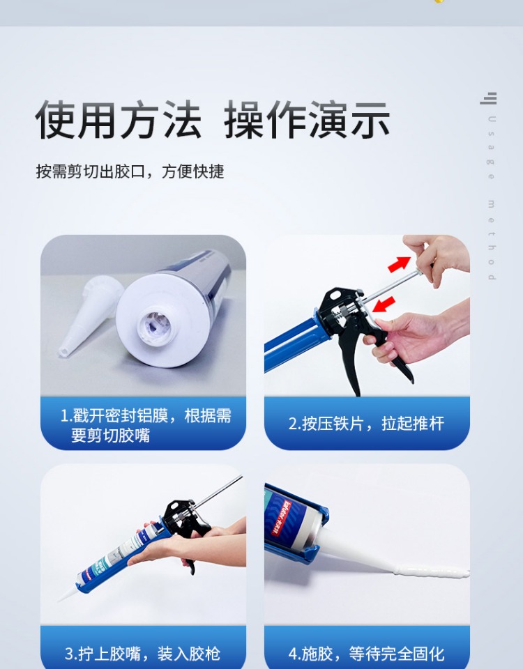 2、操作完成后,未用完的胶应立即拧紧盖帽,密封保存。再次使用时,若封口处有少许结皮, 将其去除即可,不影响正常使用。