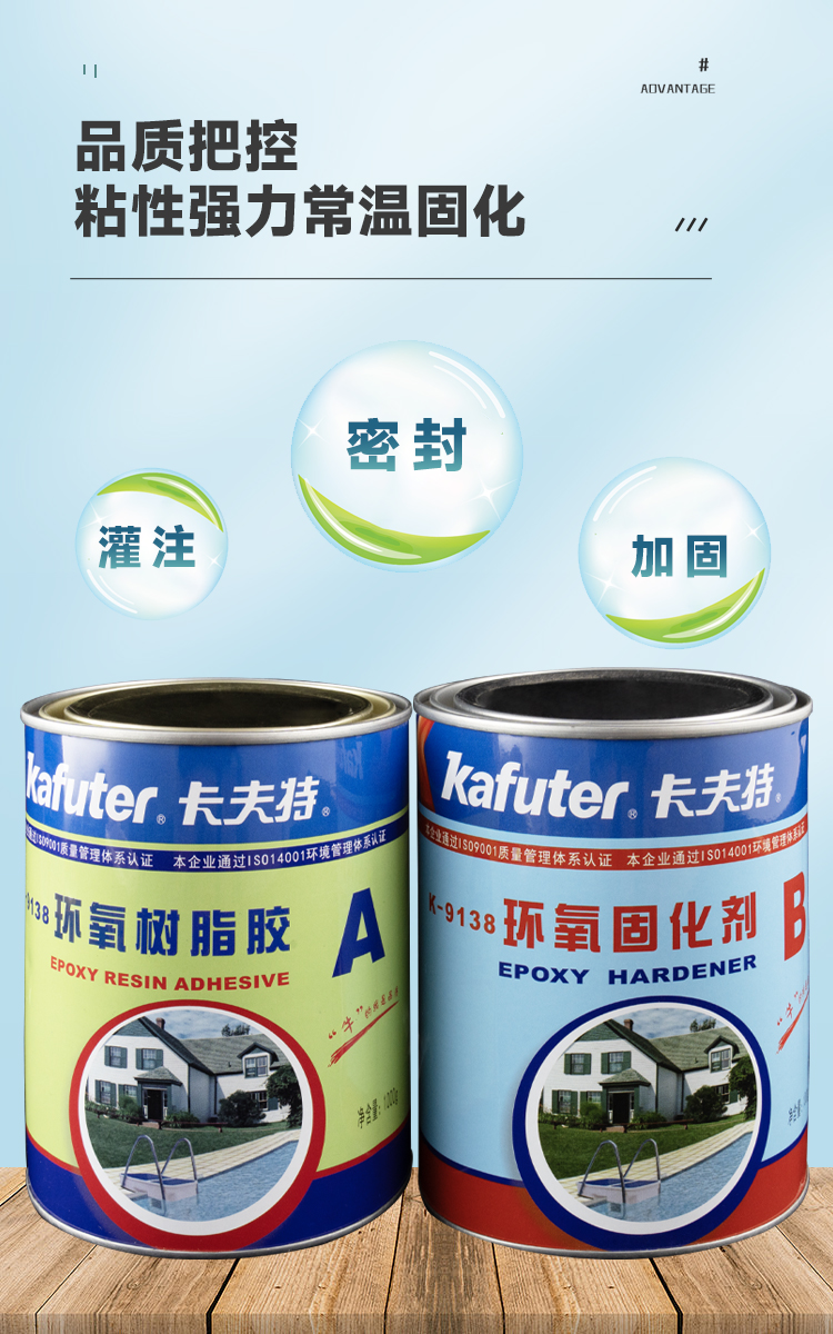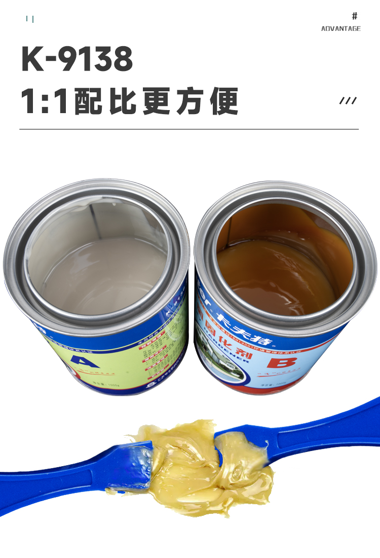 K-9138本产品为常温固化型双组分环氧胶,其在常温情况下固化速度适中,而且在-20C的温度条件下也可完全固化。固化后耐水、耐油、耐弱碱、耐酸及耐溶剂和化学品,因此可普遍用于金属和石材的自粘或互粘,用于硬质材料的粘接和修补,建筑材料粘接。