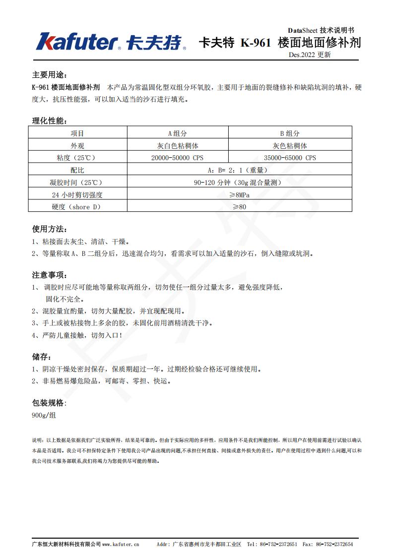 卡夫特961楼面地面修补剂,双组份环氧树脂,低粘度,易流平,附着力强,适合填缝,可快速修补水泥、砖墙的楼面及地面裂缝。卡夫特Kafuter官方授权经销商-东莞德润密封材料有限公司www.gzderun.com,销售服务热线:15817734885,李经理