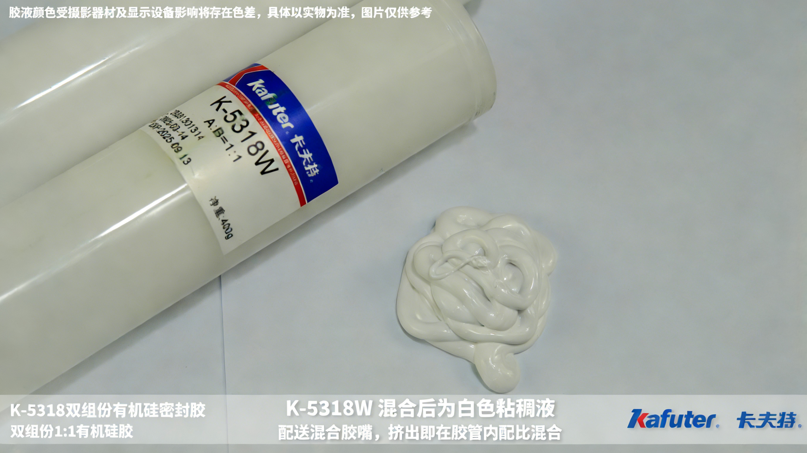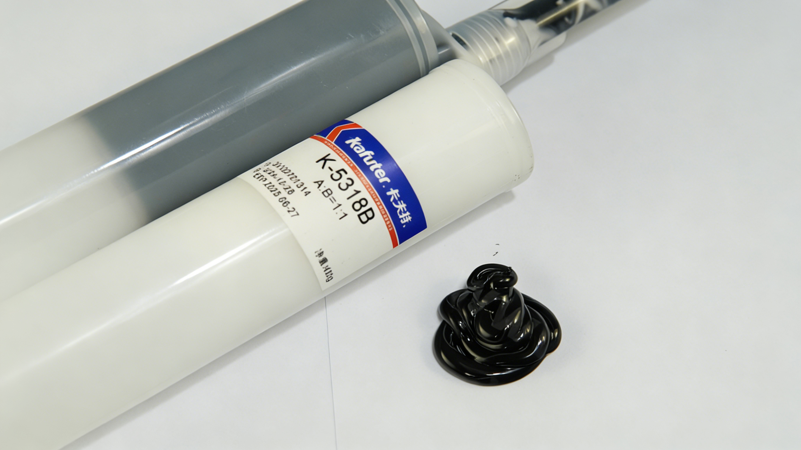 K-5318W产品兼顾单组分硅时操作便利性和双组份硅胶深层固化特性的优点,双管包装由胶嘴自动混合。适用于一般电子器件的结构粘接和密封,对多种金属类材料(如铁、铝、不锈钢等),非金属(如玻璃、陶瓷等),塑料(如PC等)具有较好的粘附性。